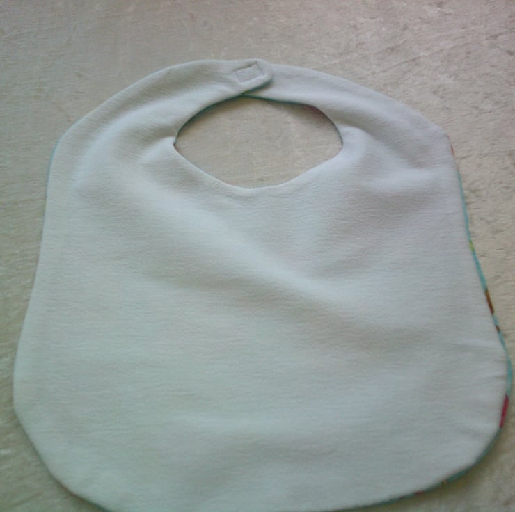 The bib measures approximately 12 inches (30 cm) from the back of the neck, and approximately 9 inches (23 cm) from the front opening to the bottom.