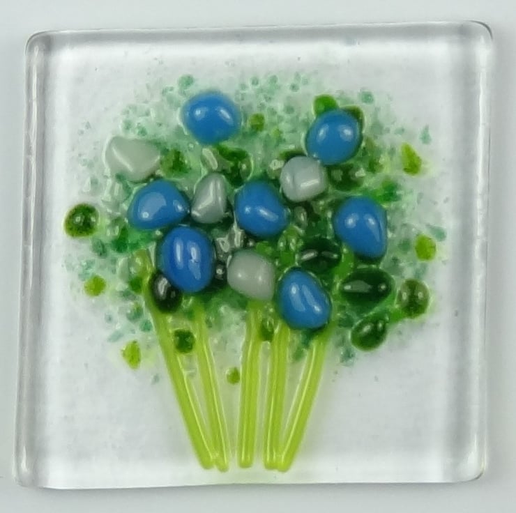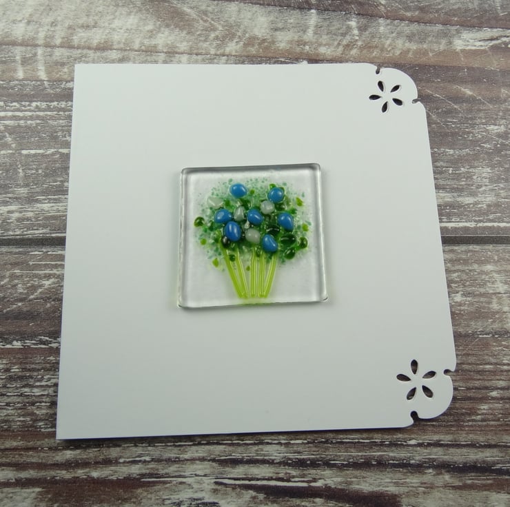 Blue & white flowers handcrafted fused glass greeting card, blank inside (439)
