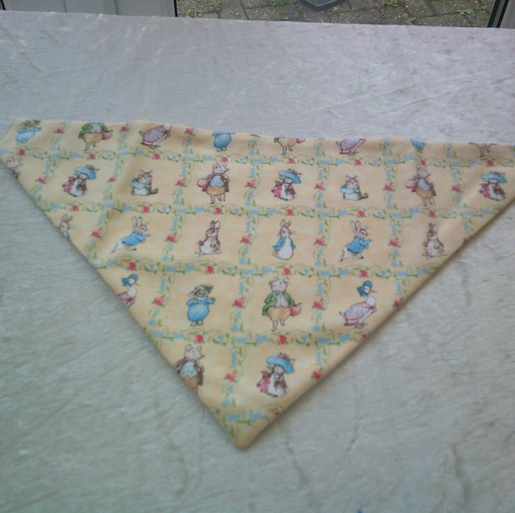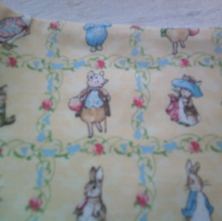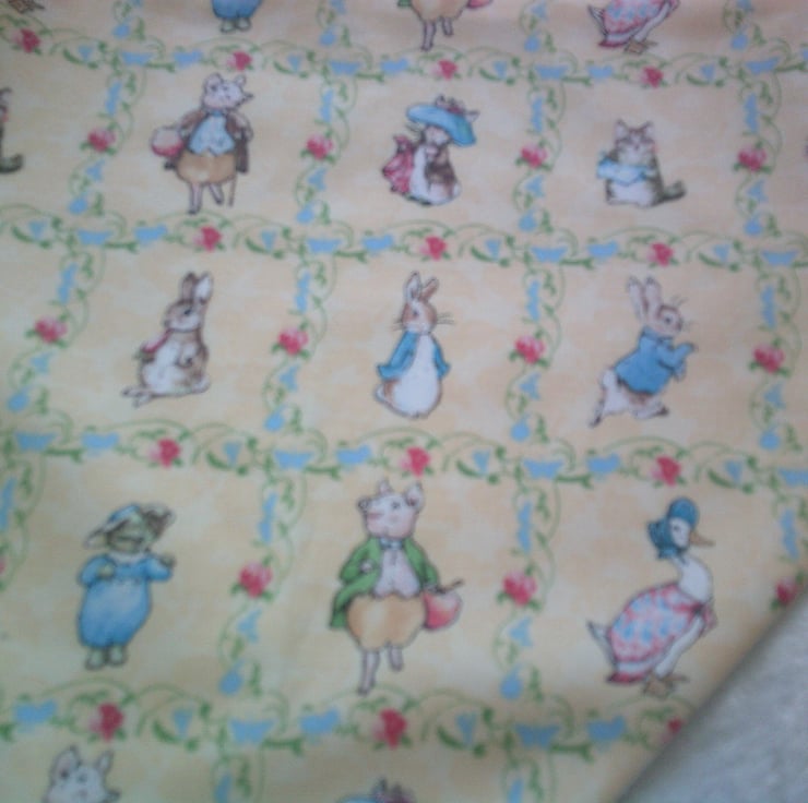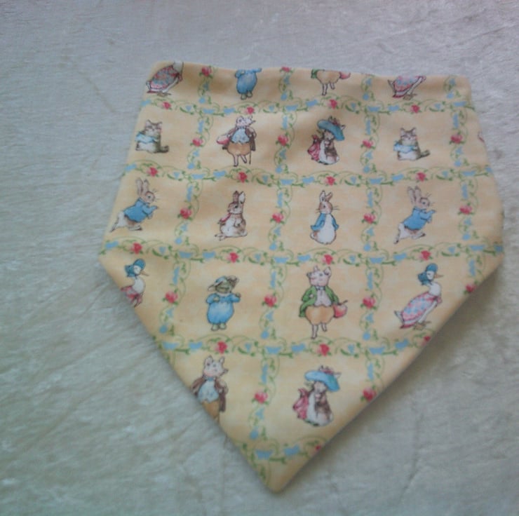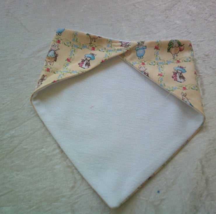 The fabric used for this dribble bib is of Beatrix Potter characters including Tom Kitten, Pigling Bland and Peter Rabbit in Foliage squares on a dark cream background.
