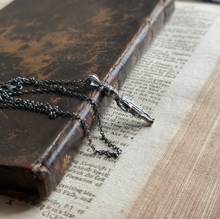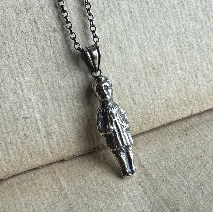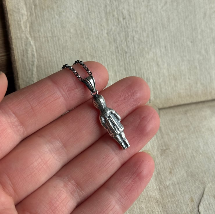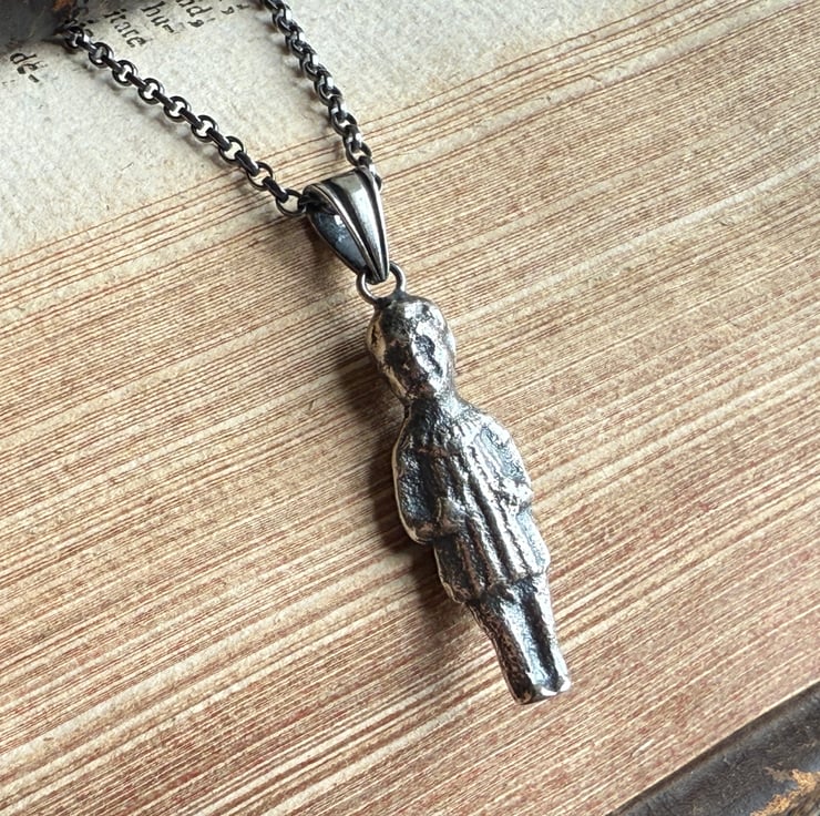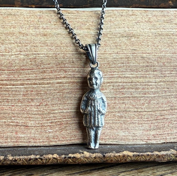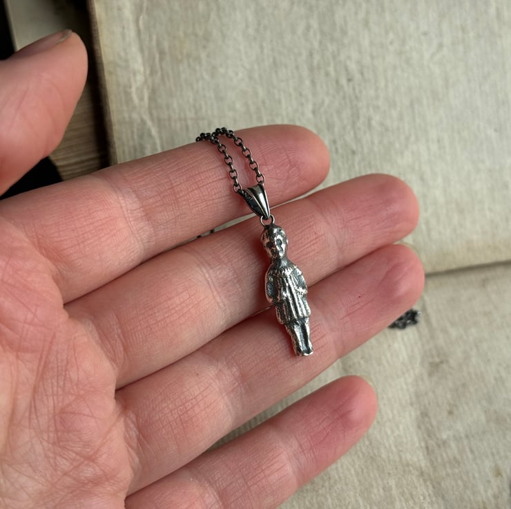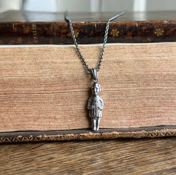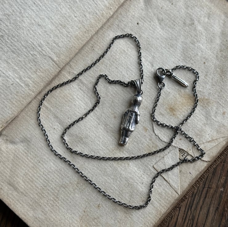 A one of a kind Sterling silver puddling doll pendant, The 1 inch doll was cast from an original antique porcelain pudding doll/ feve found by our friend, Sarah of Manchester Mudlarks.