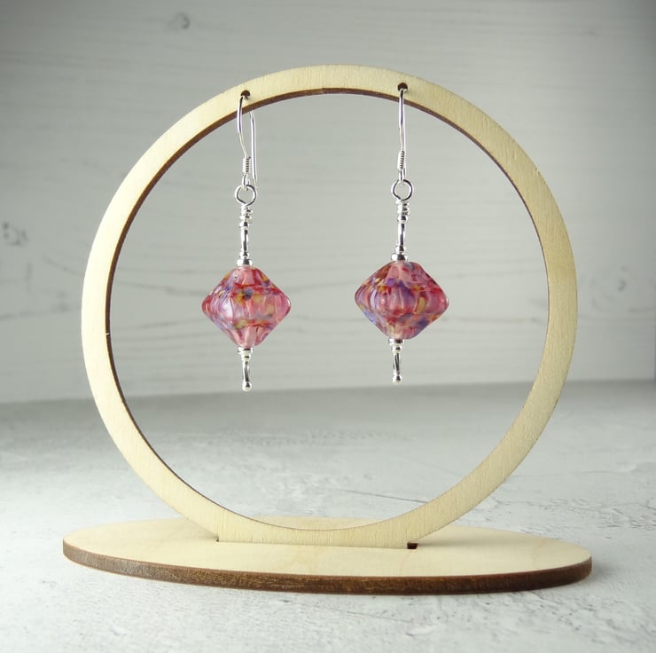 Pink purple speckled lampwork glass drop earrings, sterling silver, gift box