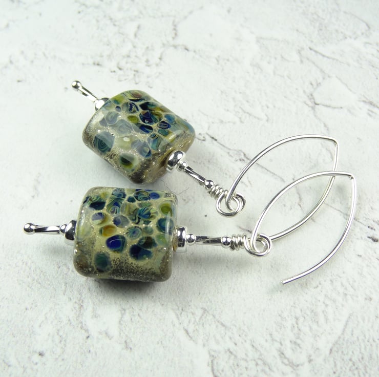 Blue green beige with silver flecks, slab-shaped handcrafted glass earrings