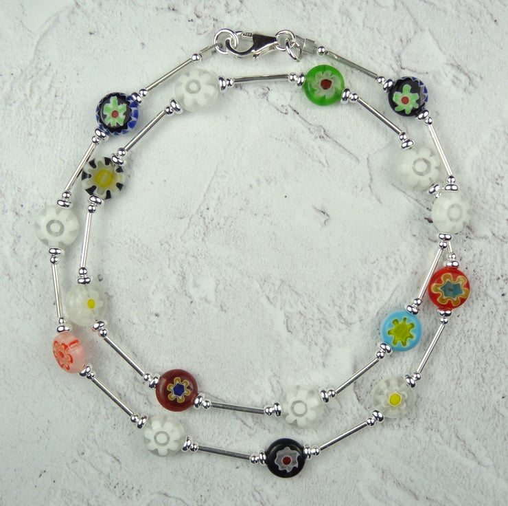 Sterling silver and multi-coloured 8mm (-) Millefiori-style glass coin beaded necklace, strung on durable Beadalon 49-strand beading wire, and finished with a lobster clasp. The patterned glass beads are in a range of colours - blue, black, white, red, green.