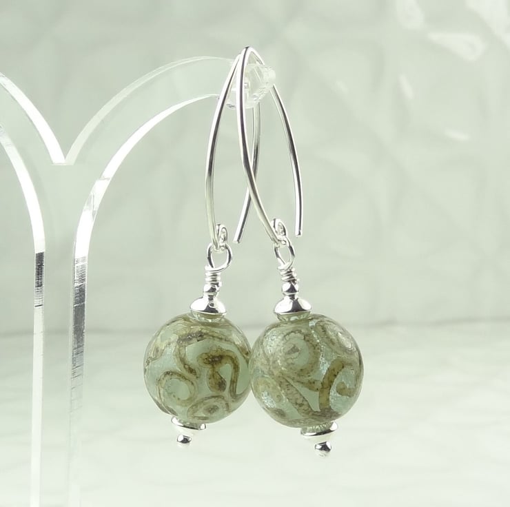 These lampwork glass pale green glass beads have been decorated with silvered ivory scrolls and have been handcrafted by a glassmaker in the UK. The beads have been given an 'aged' finish. I then use these handcrafted glass beads to make into drop earrings using sterling silver findings and wires throughout.