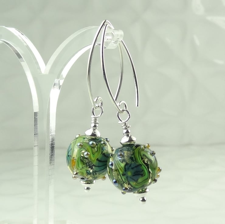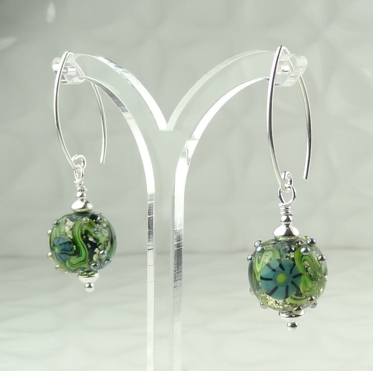 The handcrafted artisan lampwork glass beads are handcrafted by a glassmaker in the UK. I then use these handcrafted glass beads to make into drop earrings using sterling silver findings and wires throughout. The glass beads have a glittery centre with vines and raised dots.