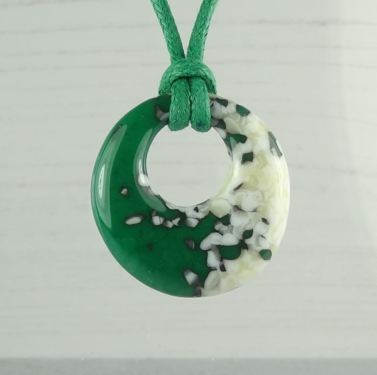 This beautiful and unusual pendant, handcrafted by myself in Wiltshire, features vibrant fused COE90 bullseye glass and is fired up to a temperature of 1,445°F. Each pendant is a unique work of art, taking approximately 19 hours from start to finish.
