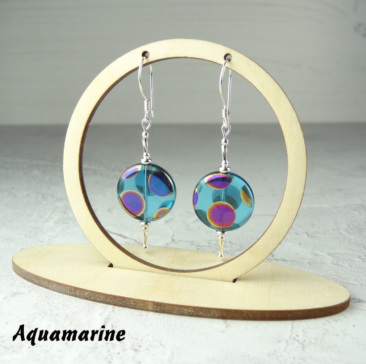 Multi-coloured Czech glass drop earrings, sterling silver, coin disc, 2 colours