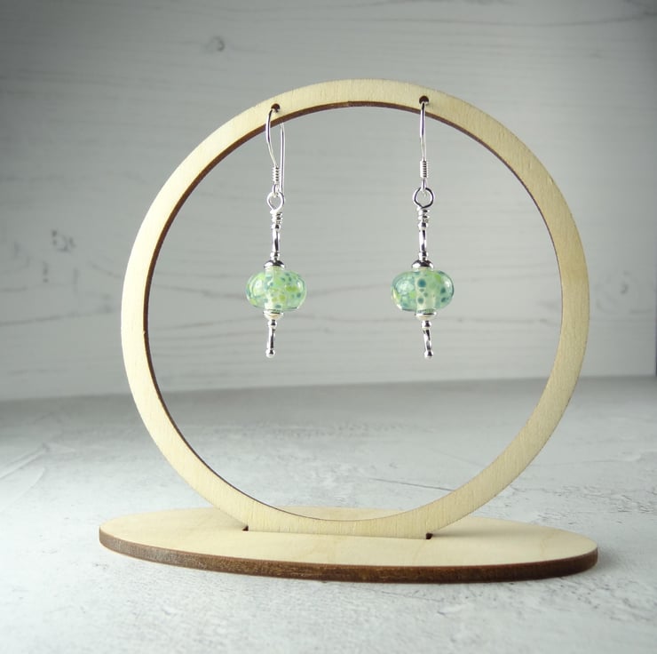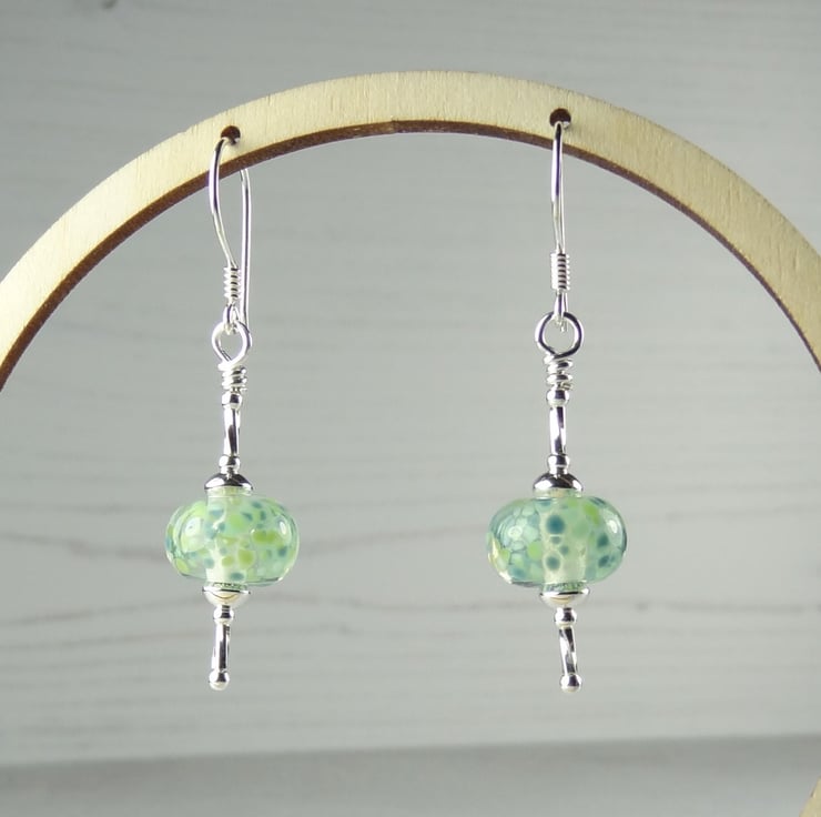 Green speckled lampwork glass drop earrings, sterling silver, handcrafted