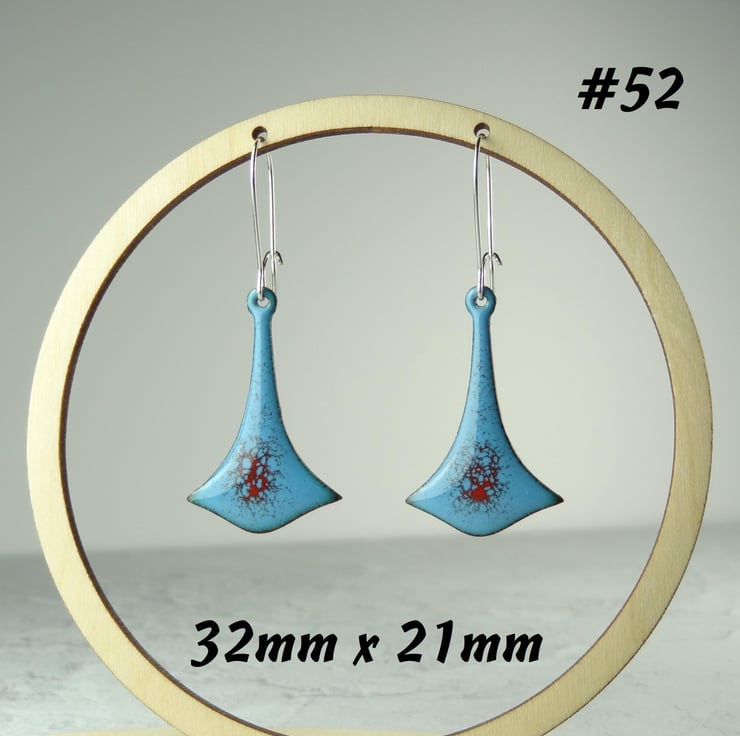 These enamelled copper drop earrings, with sterling silver wires, have been handcrafted by myself in Wiltshire. Sterling silver ear wires have been used for the earrings instead of copper to minimize the risk of skin irritation through the ear.