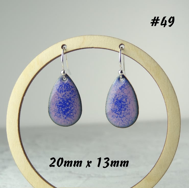 Speckled mauve-pink blue glass enamelled copper drop earrings, teardrop, 20x13mm