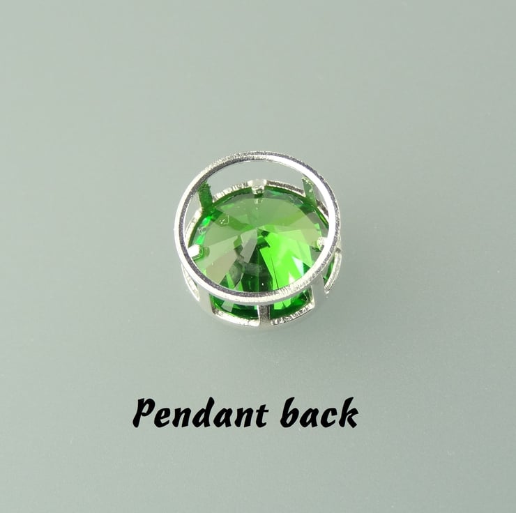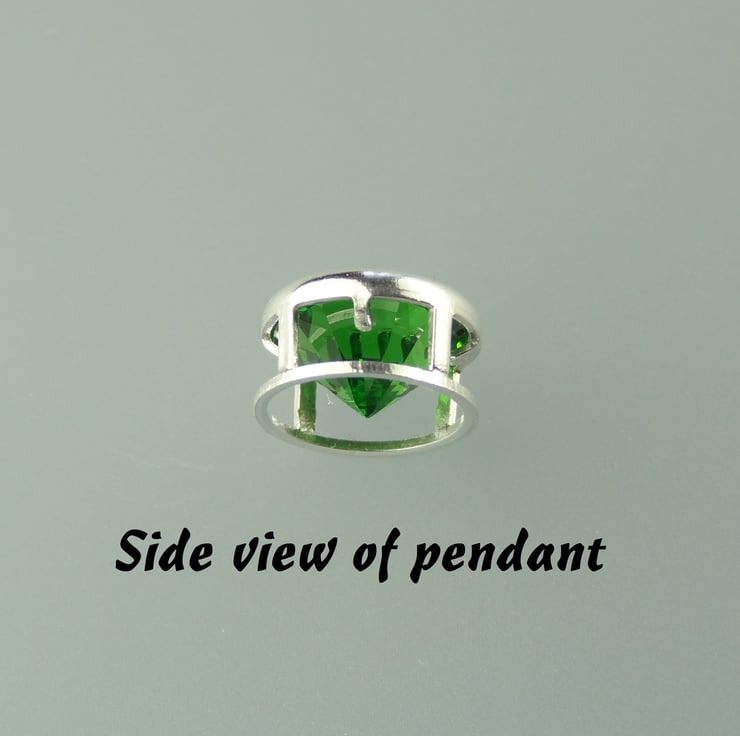 The faceted stone within the pendant has a flat top, with a pointed bottom. The light can shine through this necklace as the sides are mainly open. The back/reverse of it is also open. Photos attached explain this better.