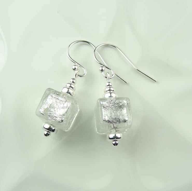 Crystal silver Murano glass drop earrings, sterling silver, cube, 8mm, gift box