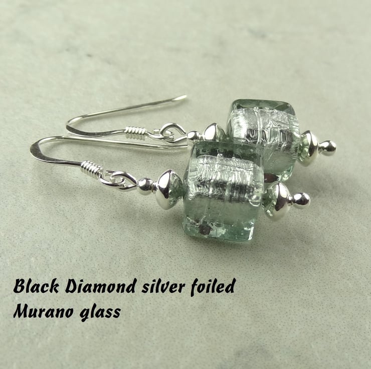 Sterling silver 7mm grey genuine Murano glass cube drop earrings, in a gift box