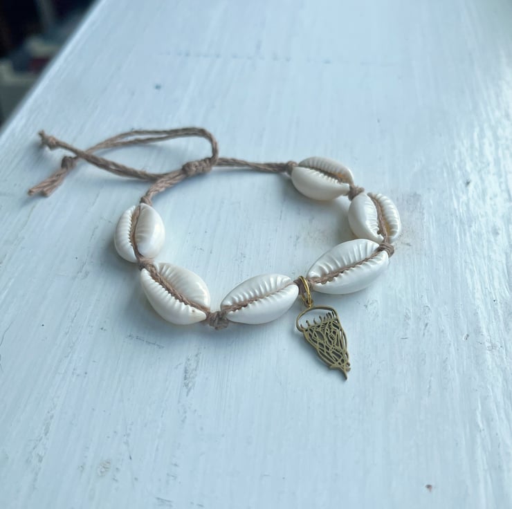 Natural hemp cord, shells and a stainless steel jellyfish charm.