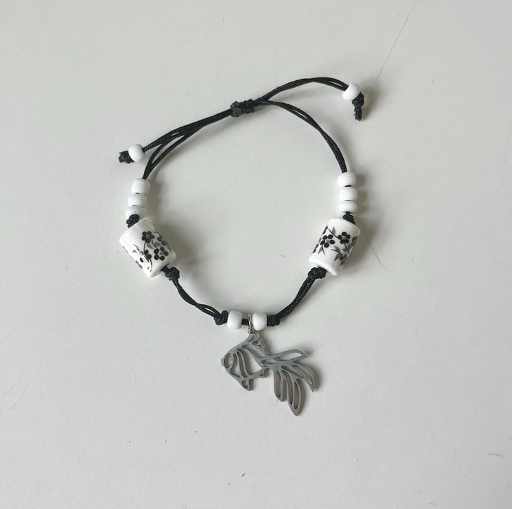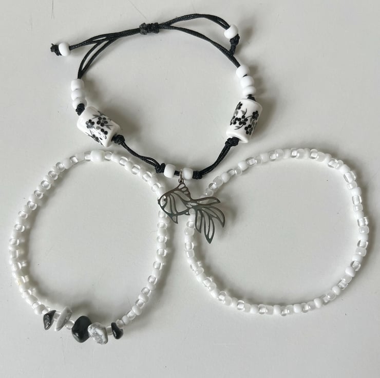 Set of black and white bracelets featuring blossom beads, natural stones and a stainless steel koi fish charm