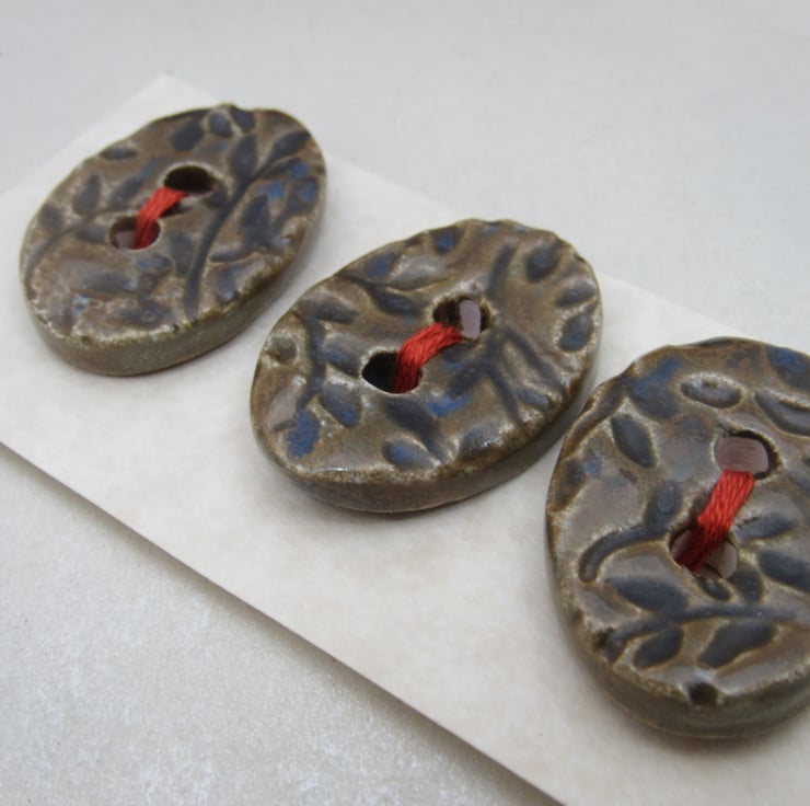 3 Medium Oval Stormy Olive Leaf Pattern Handmade Ceramic Buttons