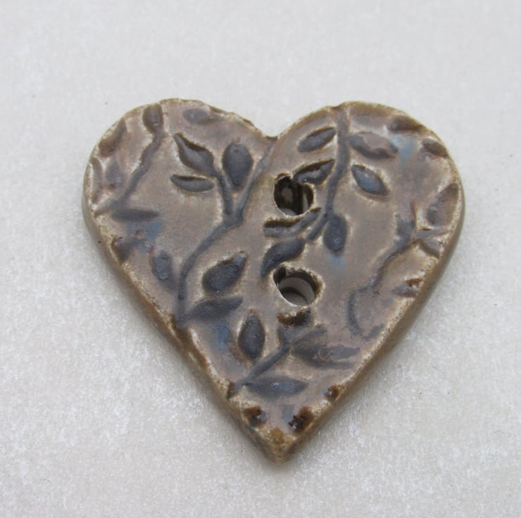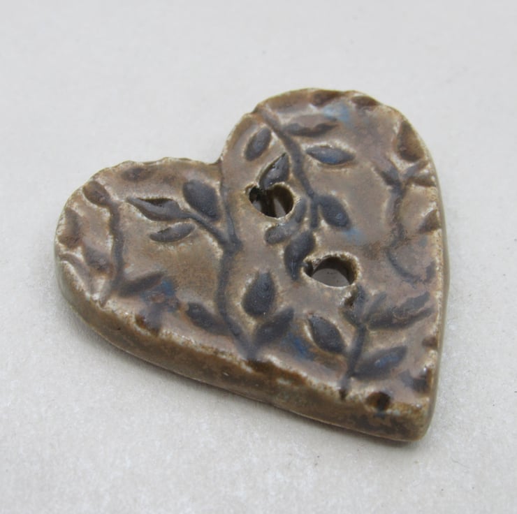 Medium heart shaped stoneware button, textured with a delicate leaf motif.
