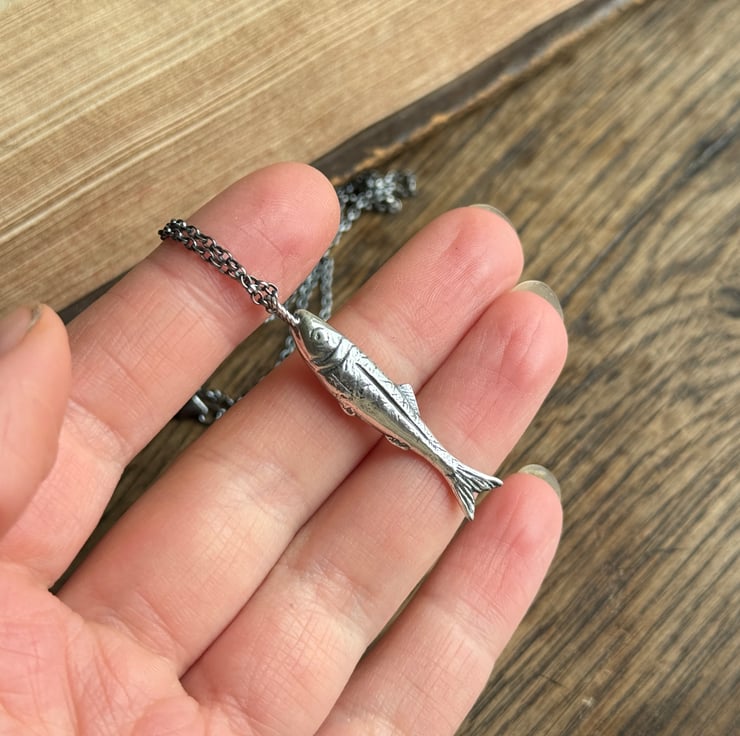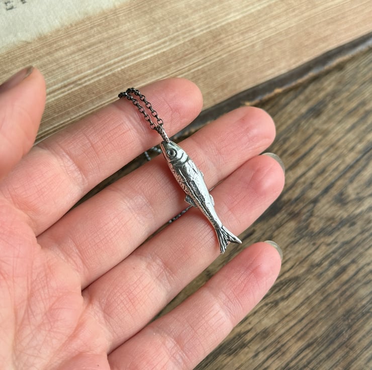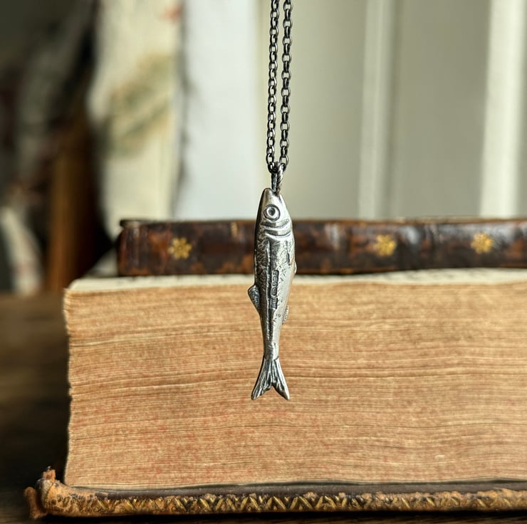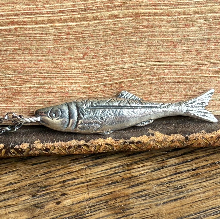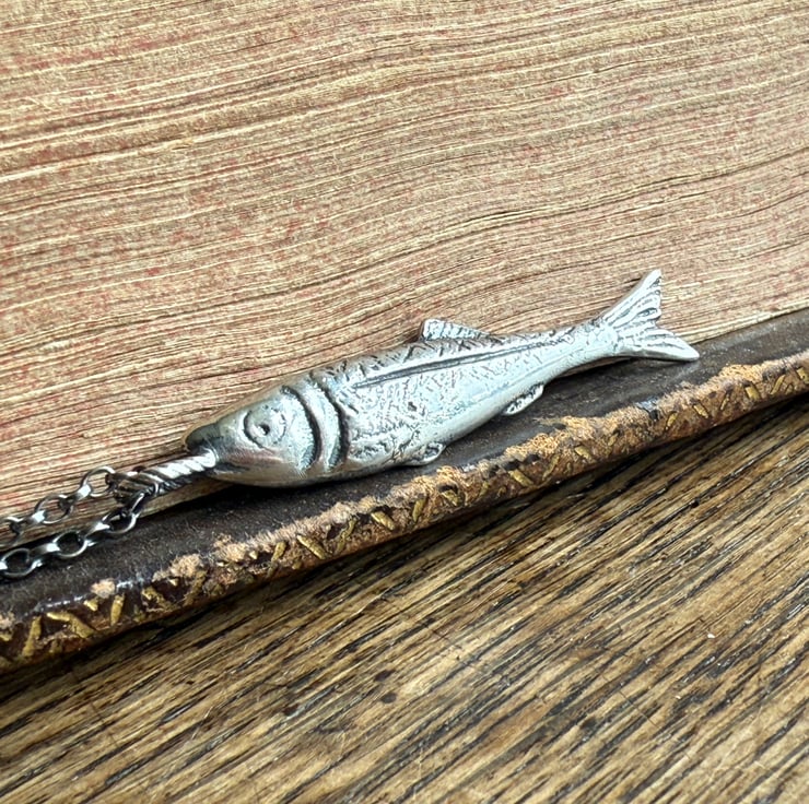 This wee fish is a tribute to our heritage. A few years ago we found a fish paste pot on a river foreshore, it was from North Shields and couldn’t help but wonder if it were our family who caught and processed the herring sold in that little pot. So, I (Alex) hand carved and cast these little ‘silver darling’ pendants in recycled sterling silver.