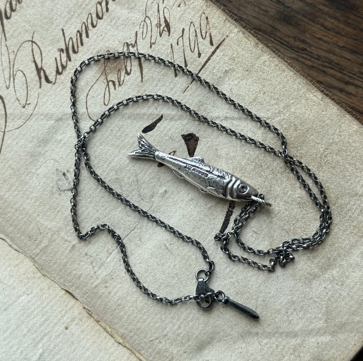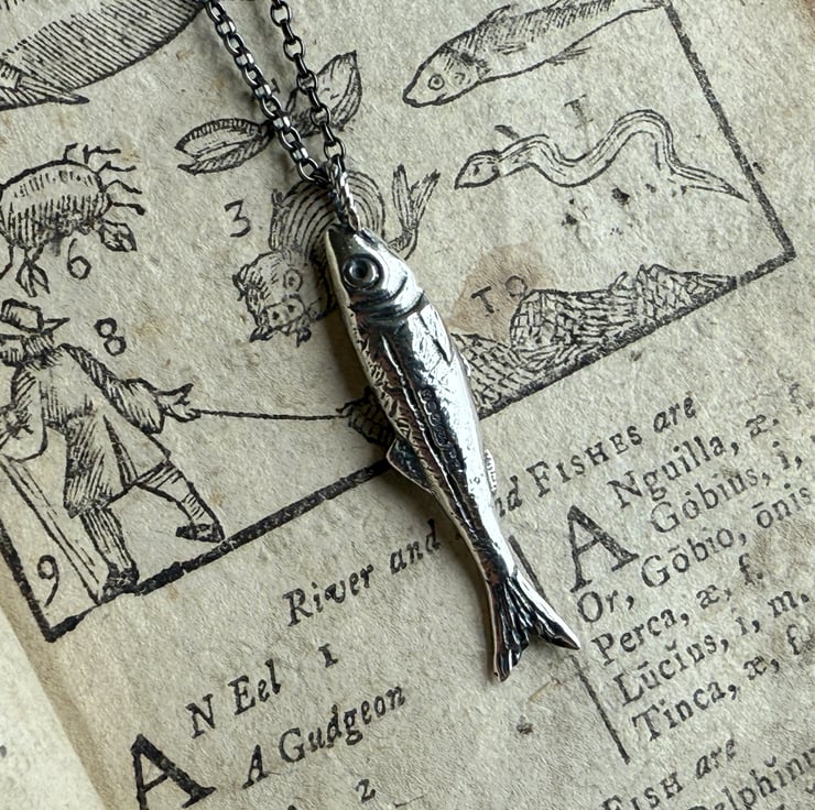 A few years ago we found a fish paste pot on a river foreshore, it was from North Shields and couldn’t help but wonder if it were our family who caught and processed the herring sold in that little pot. So, I (Alex) hand carved and cast these little ‘silver darling’ pendants in recycled sterling silver and hung them on a silver beaded chain that resemble the floats on the fishing nets.