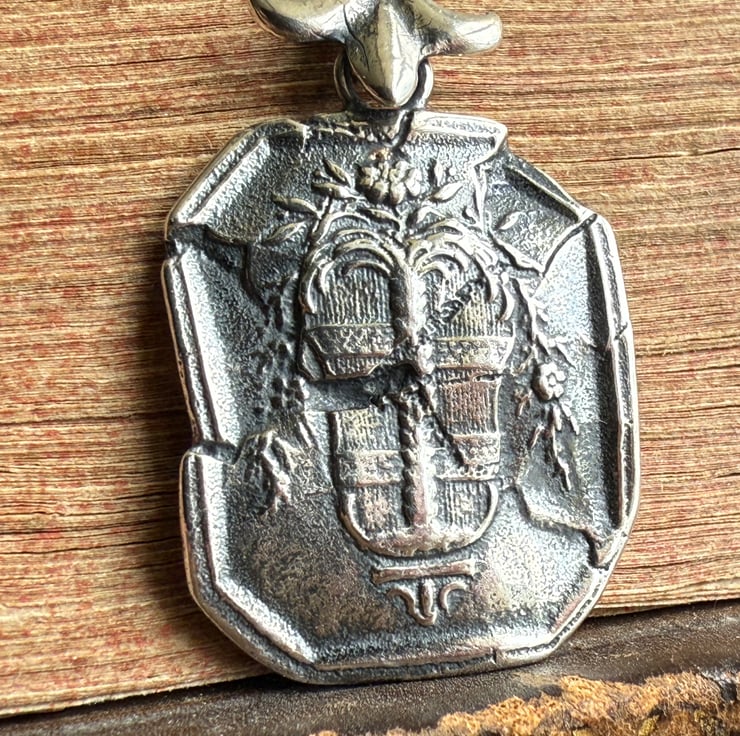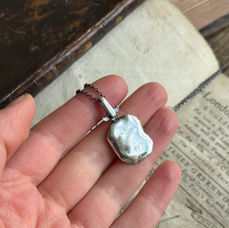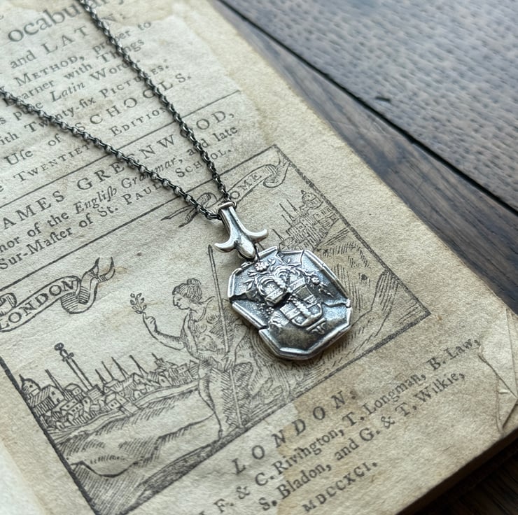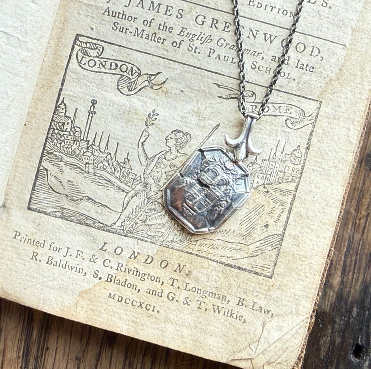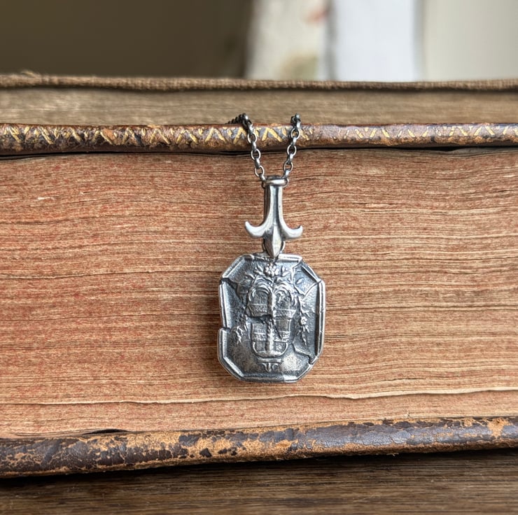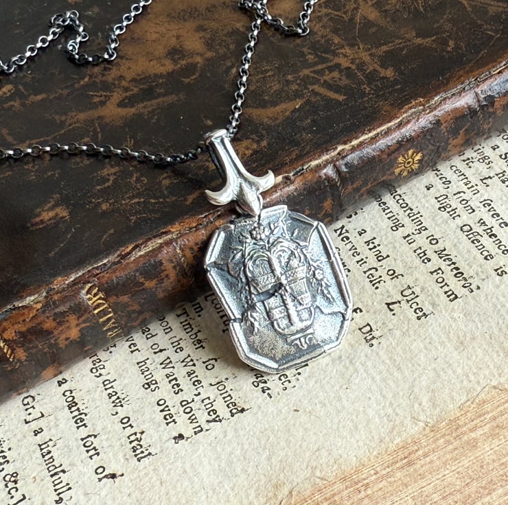 A one of a kind 'cracked' or 'shattred' effect wax seal necklace, made from the cast of an antique 18thC wax seal impression from Alex's beloved collection. It hangs from a Fleur-de-lis design bail and is made in recycled sterling silver and has been oxidised and rubbed back, enhancing the highlights for an antique look.