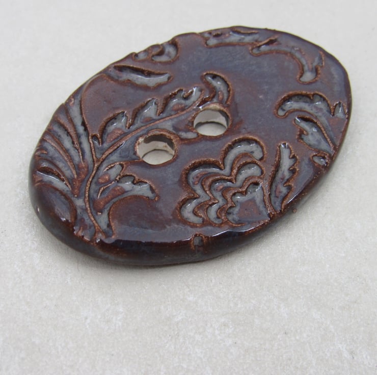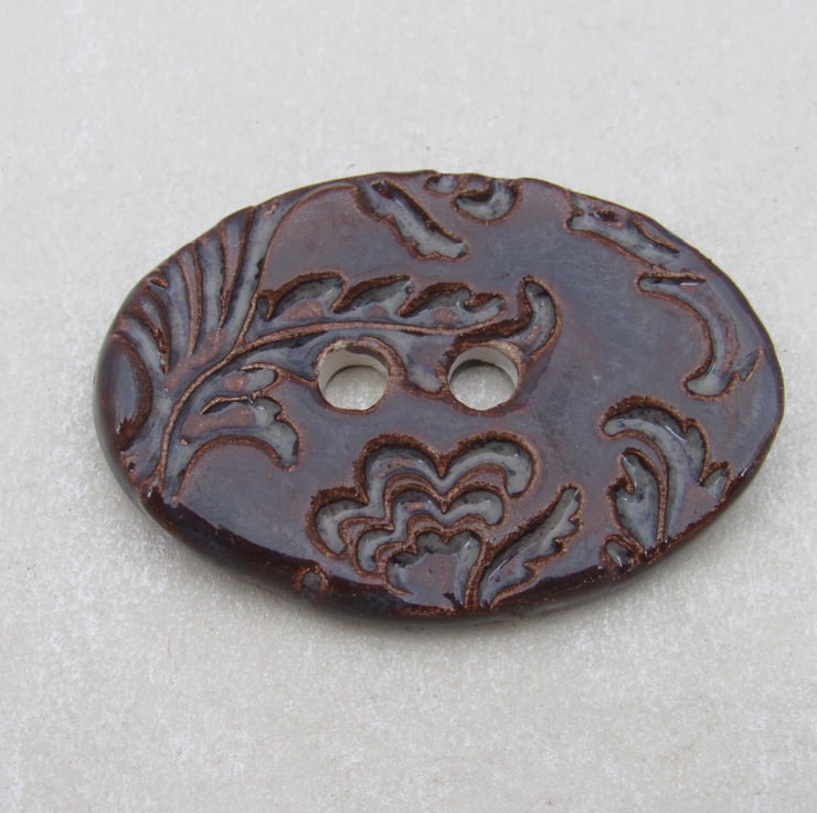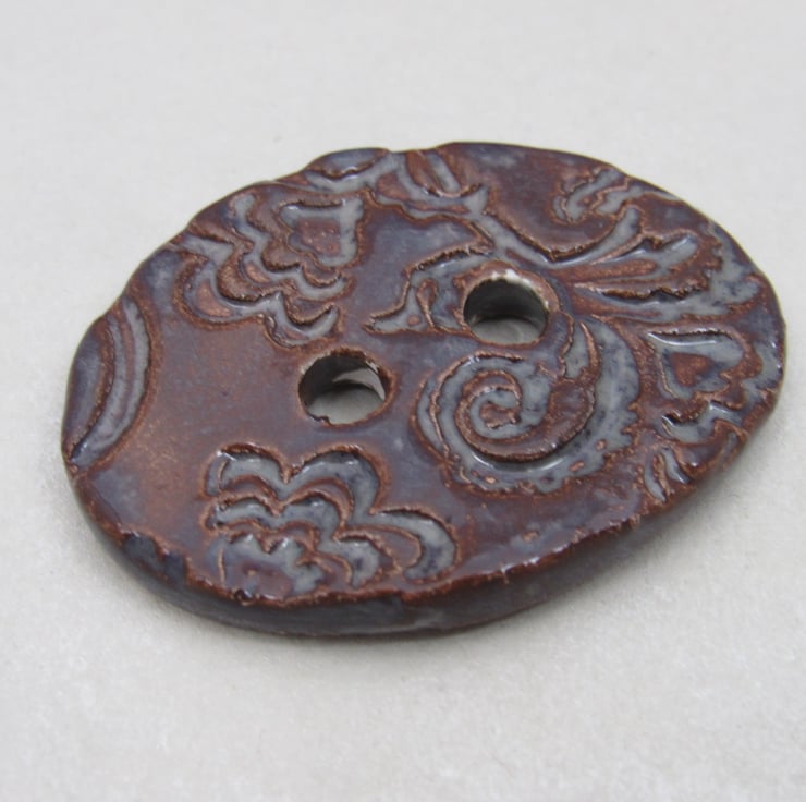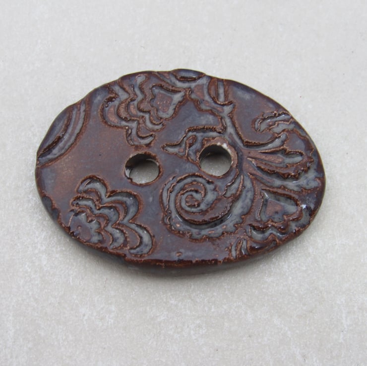 Medium oval shaped stoneware button, textured with a pretty brocade motif.
