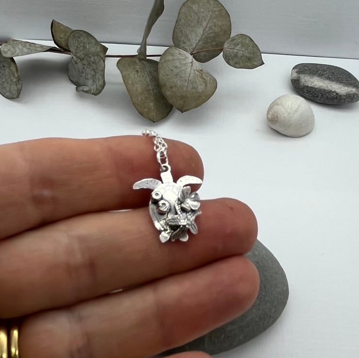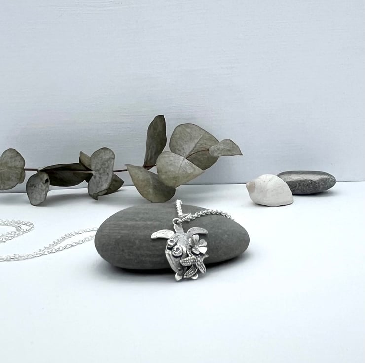 Unique one off design. Sea turtle, carrying a starfish, flower and urchins.