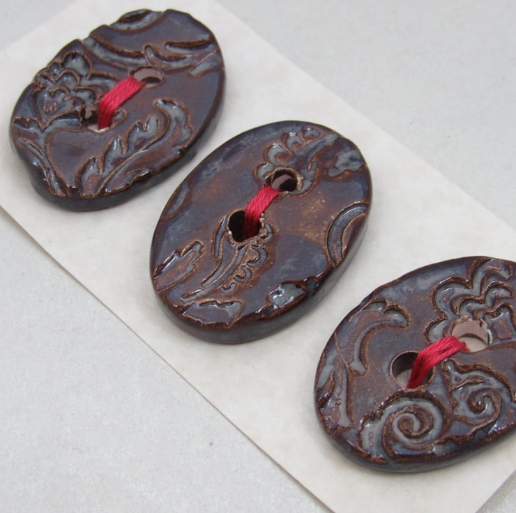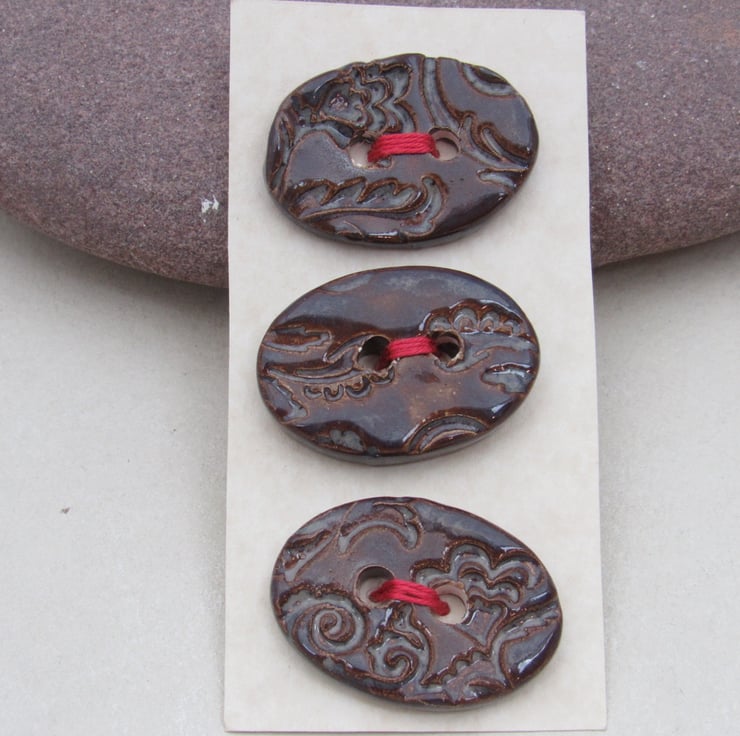 3 medium sized stoneware buttons, with a pretty brocade motif printed into the upper face.