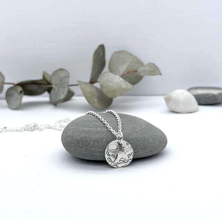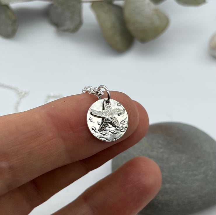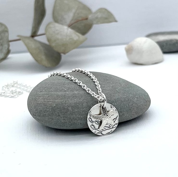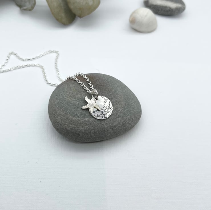 Cute little seaside design. This pendant has a silver disc with a shoal of tiny fish pressed into it with a curved, textured little starfish suspended over the top.