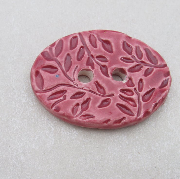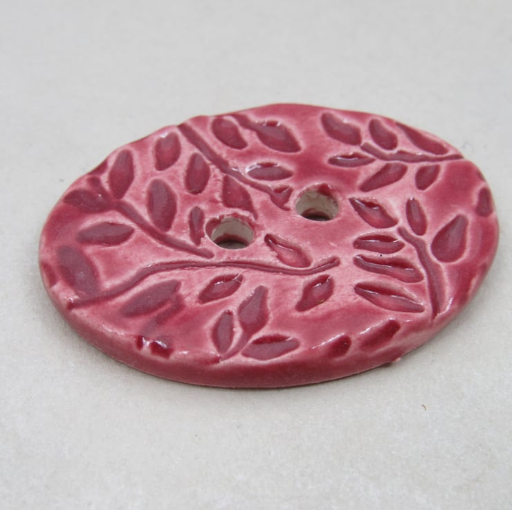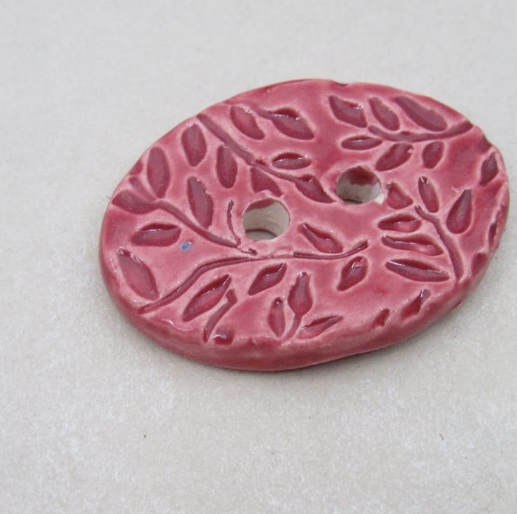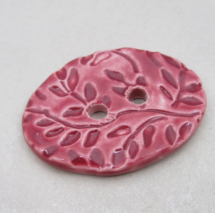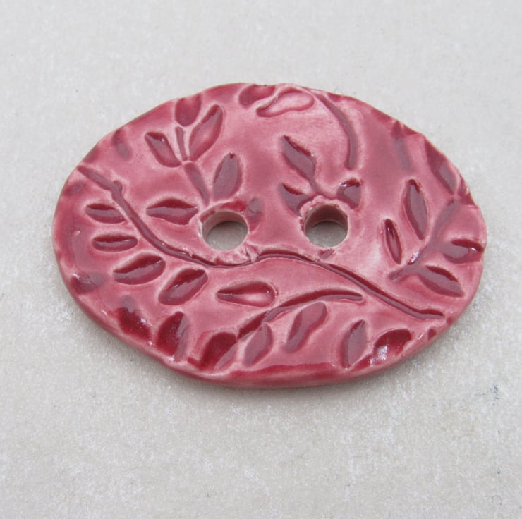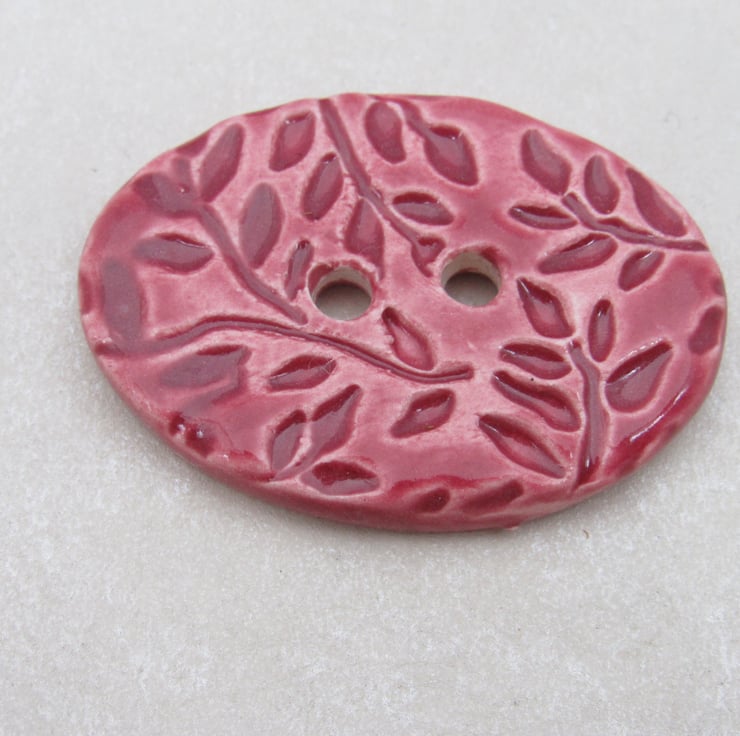 Medium oval shaped stoneware button, textured with a pretty motif of tiny leaves. Finished with a glossy rose red pink glaze