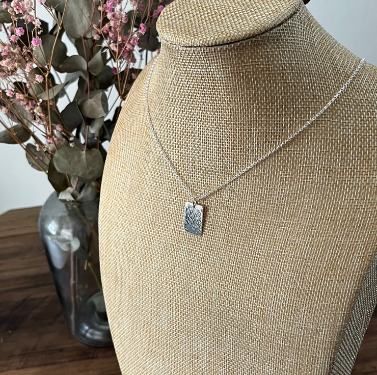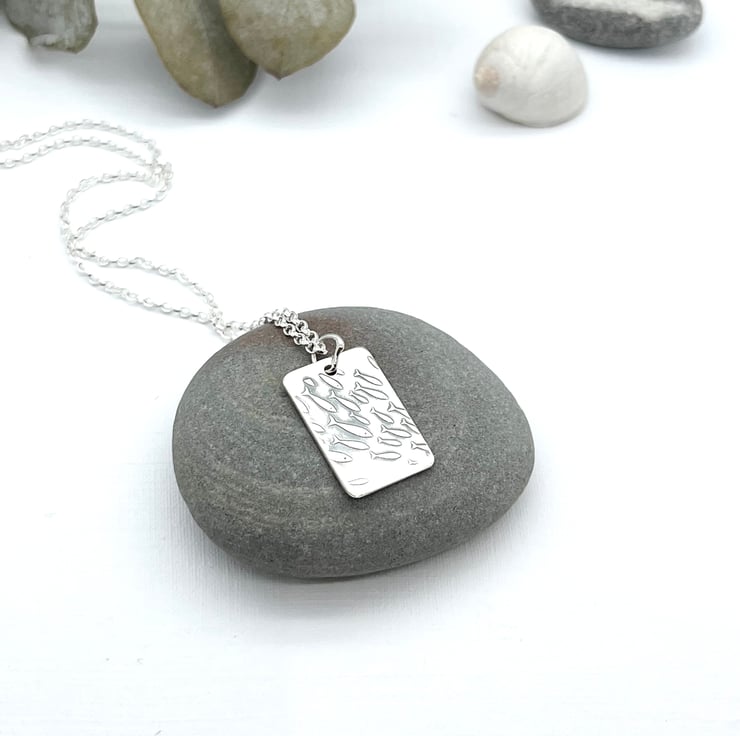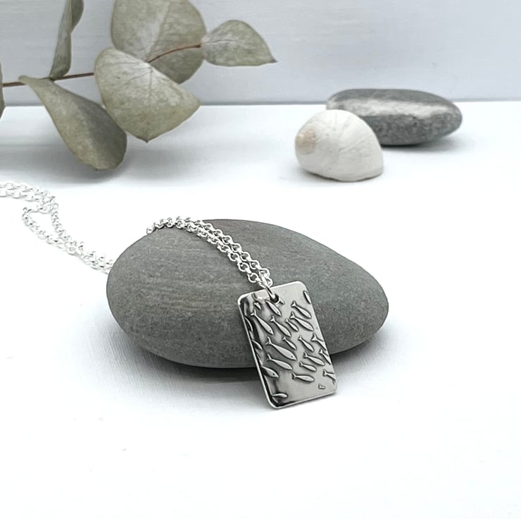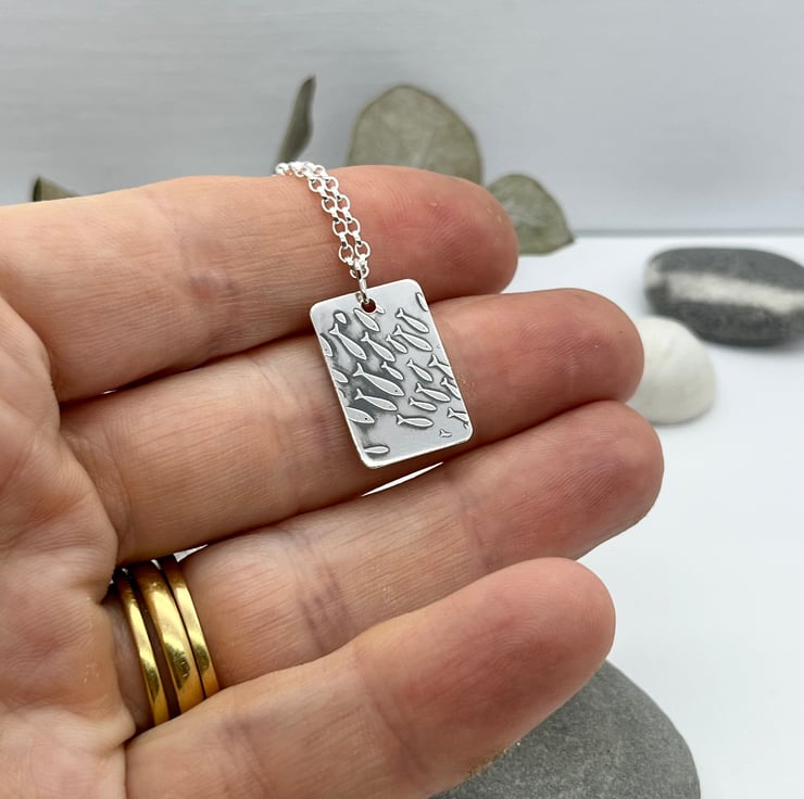 Rectangular pendant, 2 cm x 1.4 cm, with a shoal of tiny fish pressed into it. The silver is oxidised to enhance the design and polished to a mirror shine.