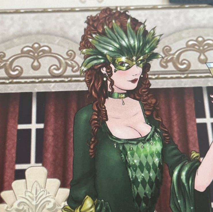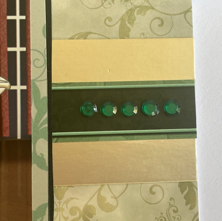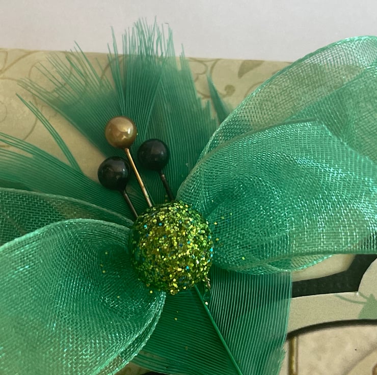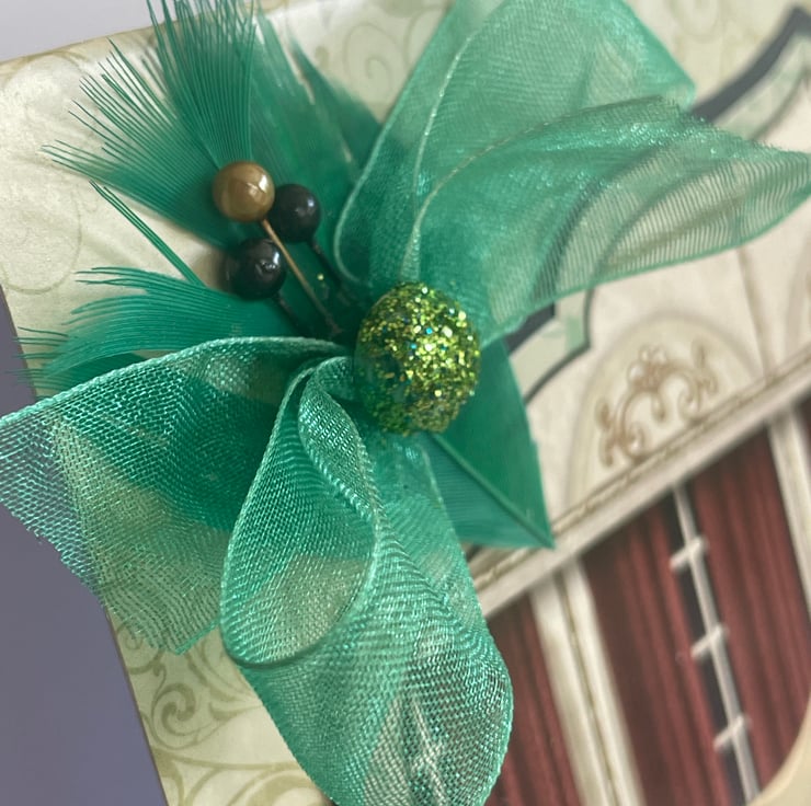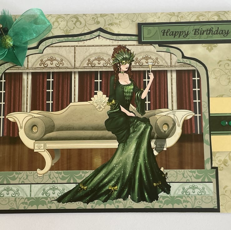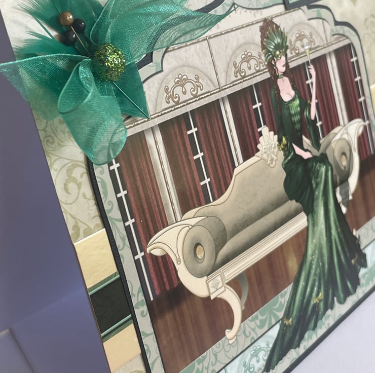 A mysterious and gothic Venetian card. This A5 sized card is an opulent Venetian design. The background is a brocade style paper in hues of pale greens. This is topped with a strip of gold card, this is decorated with a dark green border and has a line of green gems. The main design features a mysterious lady in a beautiful green dress sitting on a sofa. She is wearing a beautiful feather mask. She is holding a glass of champagne. She is in a beautiful ballroom surrounded by more brocade style swirls. There is a matching Happy Birthday greeting. The design is finished with a green bow in organza with a matching feather, hatpins and a glitter gem. Inside has the greeting Just for You.