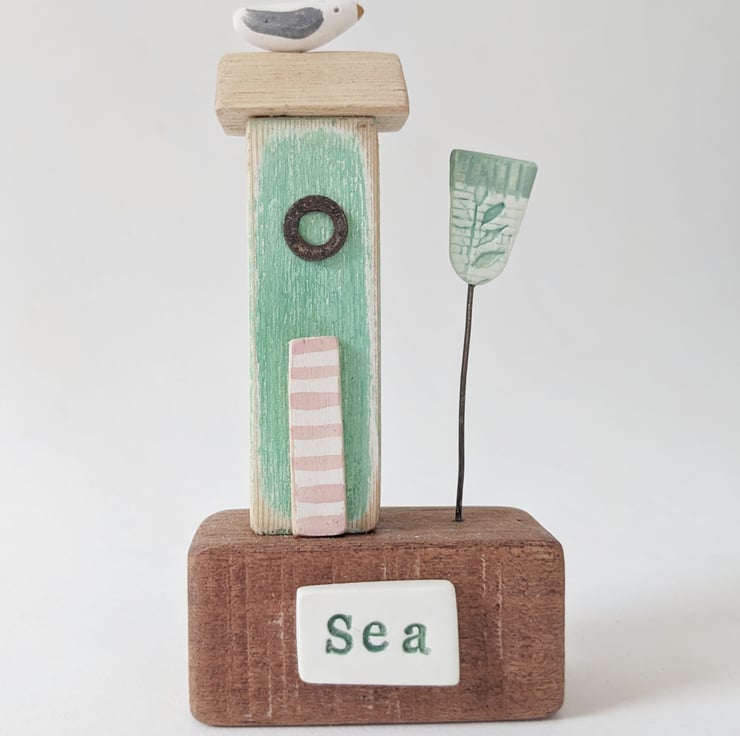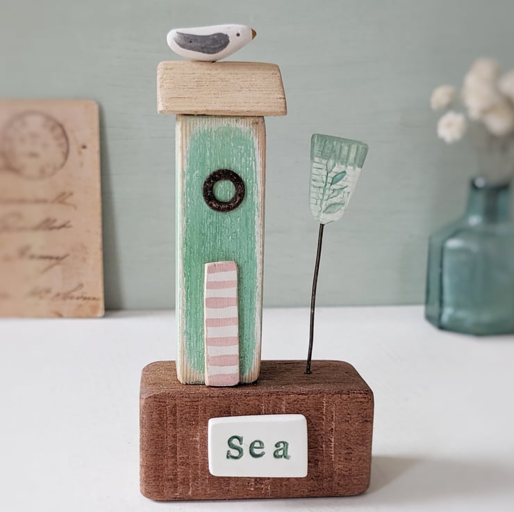 This is one of my tiny little rustic sea huts with a porthole window, a happy flower, and a hand stamped base.