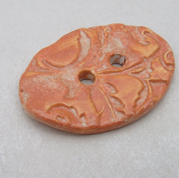Medium oval shaped stoneware button, textured with a pretty brocade motif.