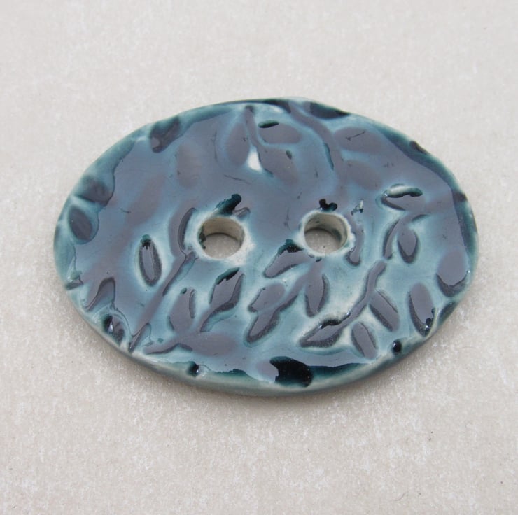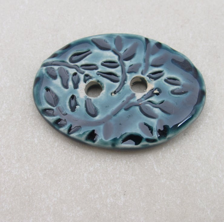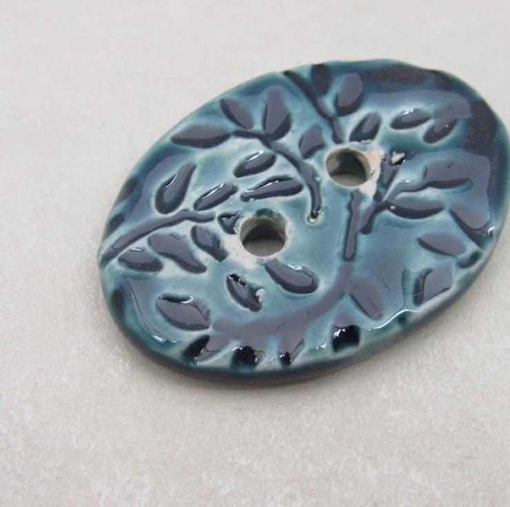 Medium oval shaped stoneware button, textured with a pretty motif of tiny leaves. Finished with a translucent petrol blue glaze.