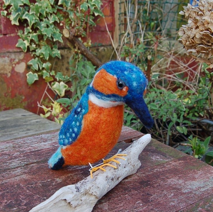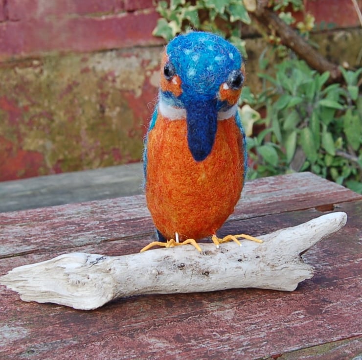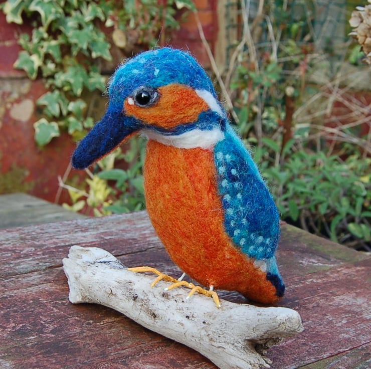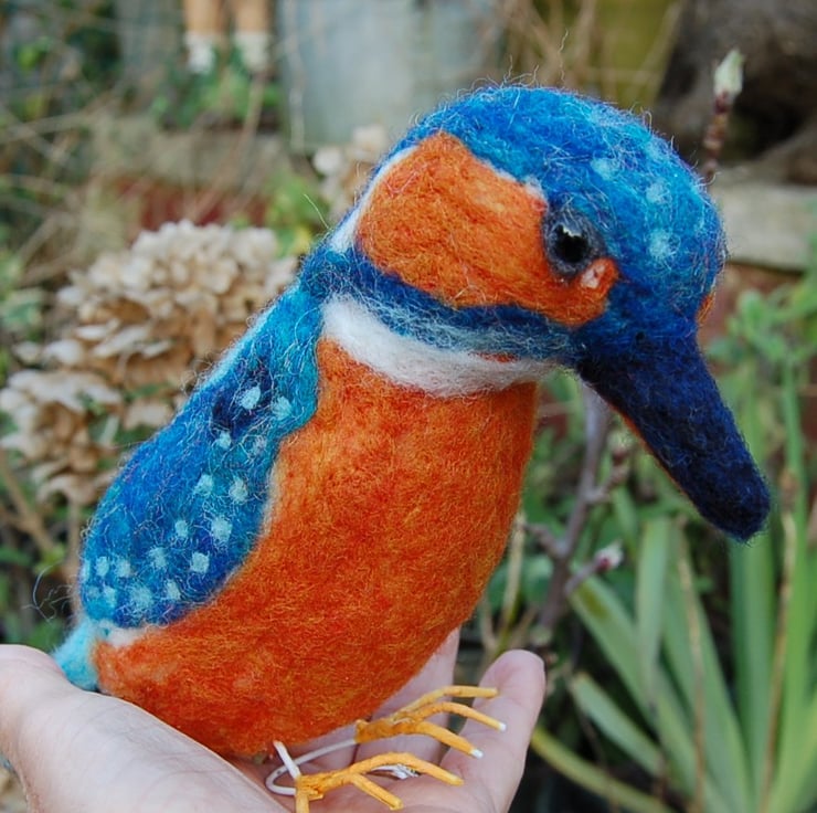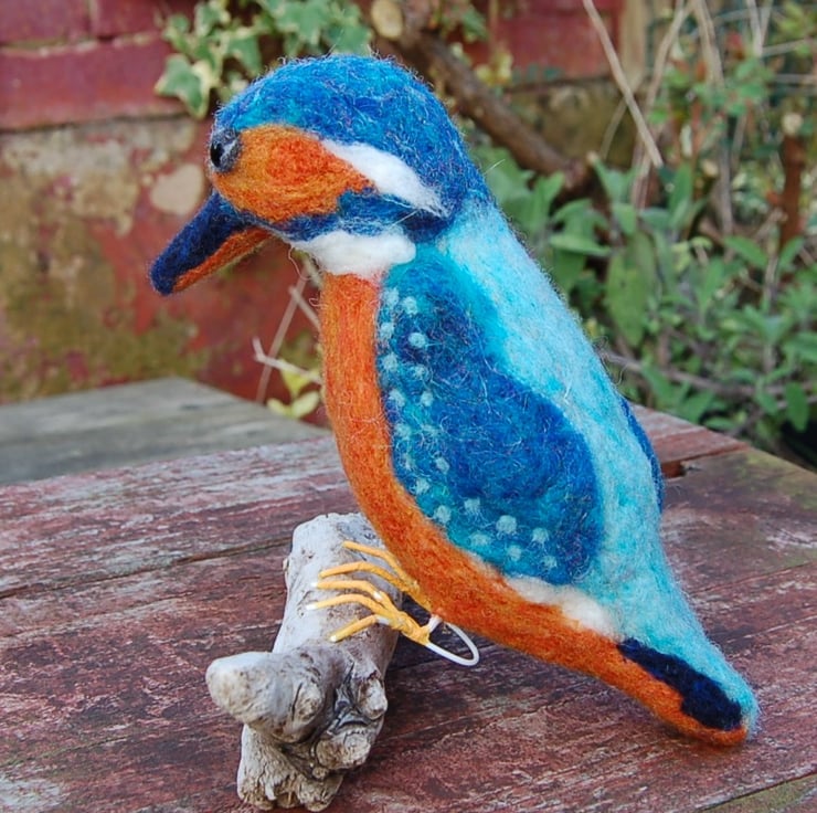 A magnificent Kingfisher sculpture needle felted from wool fibres using a sharp barbed needle over a wire frame. I've used sparkly fibres mixed with turquoise and blue for its feathers. These types of sculptures take many hours to make. All the details are hand worked.