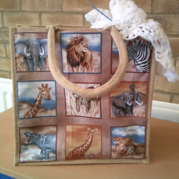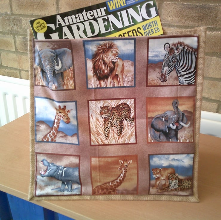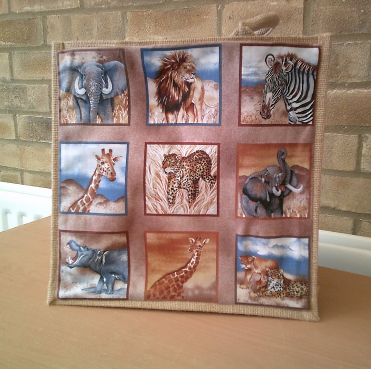 The bag itself measures approximately 30 x 30 x 20 cm (12 x 12 x 8 inches). The fabric pocket - which has been hand sewn onto the bag is a panel of 9 squares featuring Safari animals including Zebra, Elephant, Hippo, giraffe and lions.