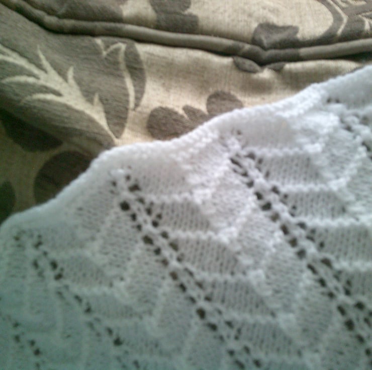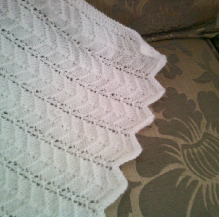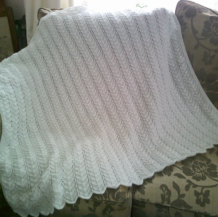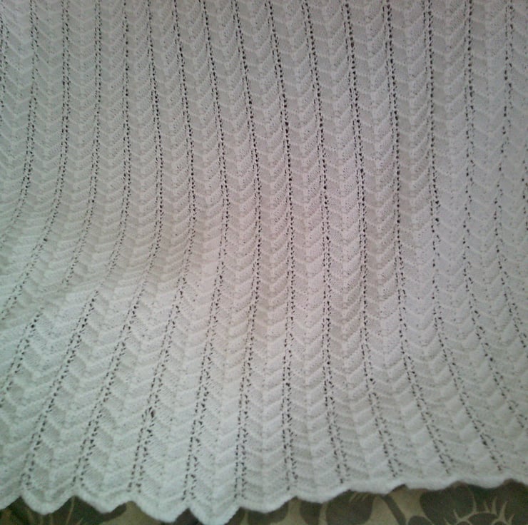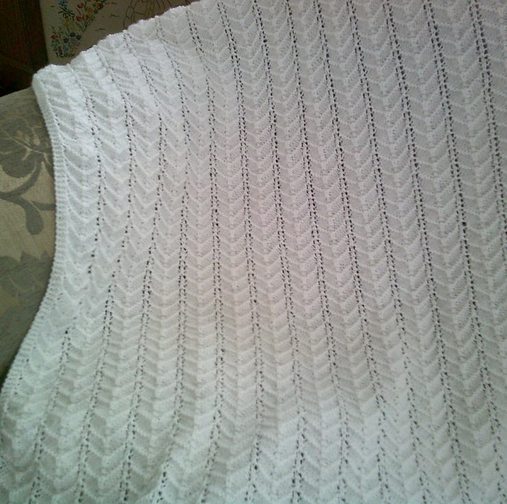 This hand knitted baby shawl measures approximately 38 inches x 38 inches (96.5cm x 96.5cm) and would make an ideal gift for a new mum who can use it to wrap baby in to bring home.