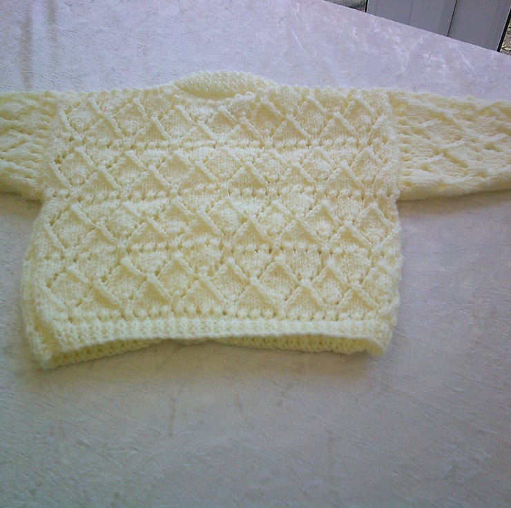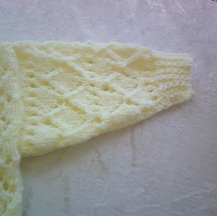 This hand knitted Lemon Lacy V Neck cardigan would make an ideal addition to a child's wardrobe.