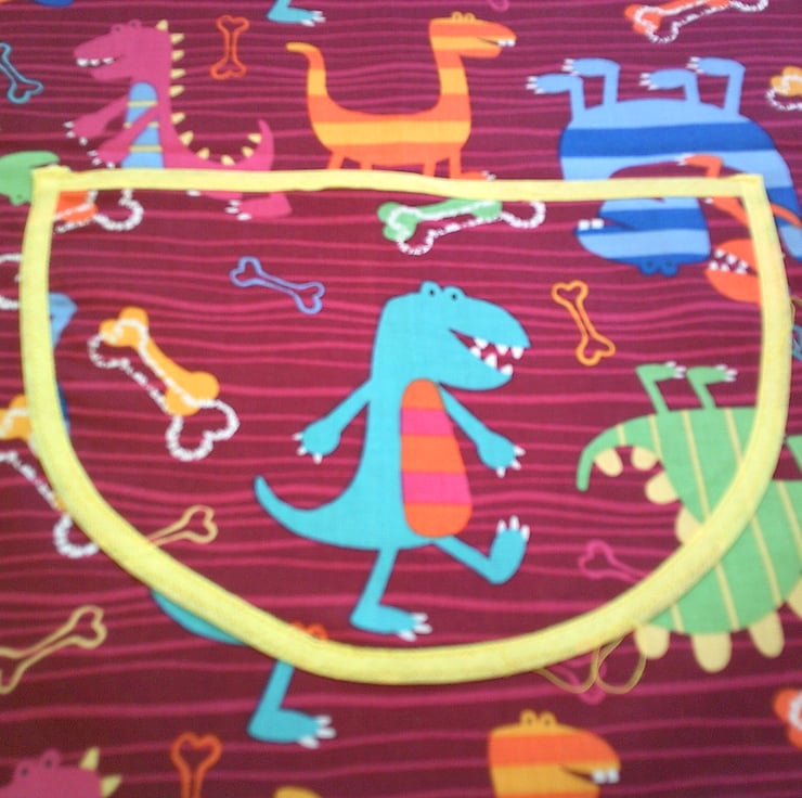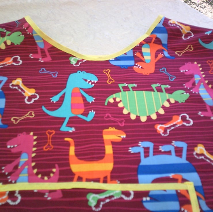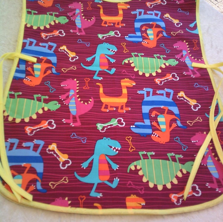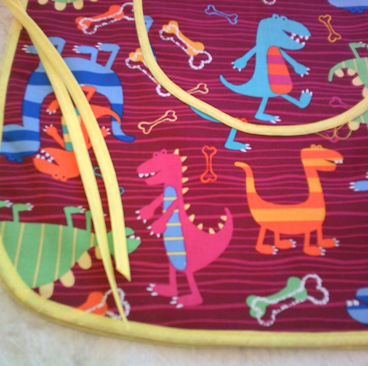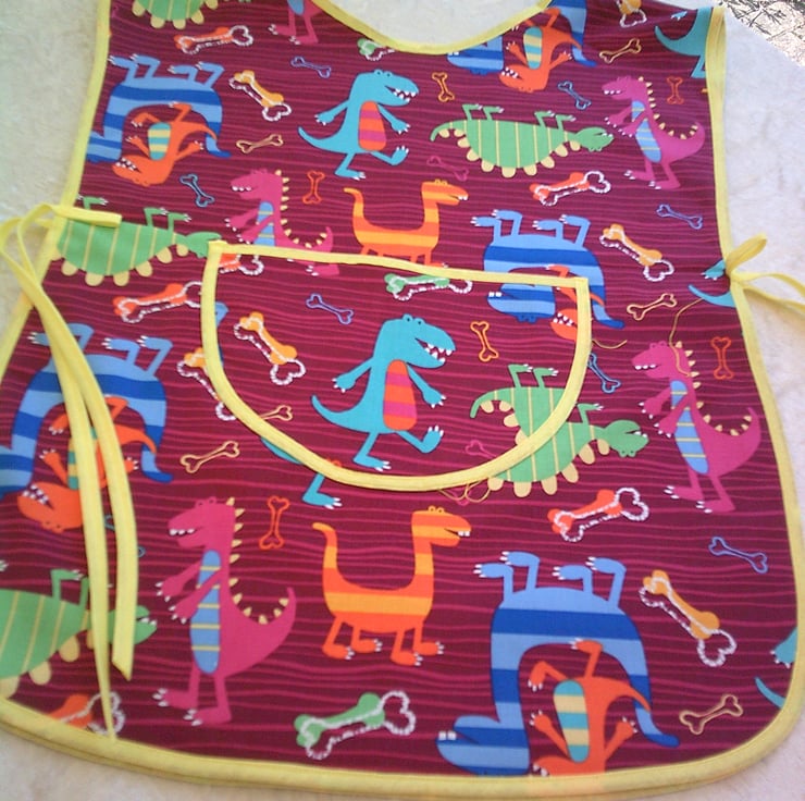 This child's tabard is made using 100% cotton fabric and has a design of colourful comical dinosaurs on maroon background and is edged with a contrasting yellow bias binding. There is a pocket on the front and ties on the sides