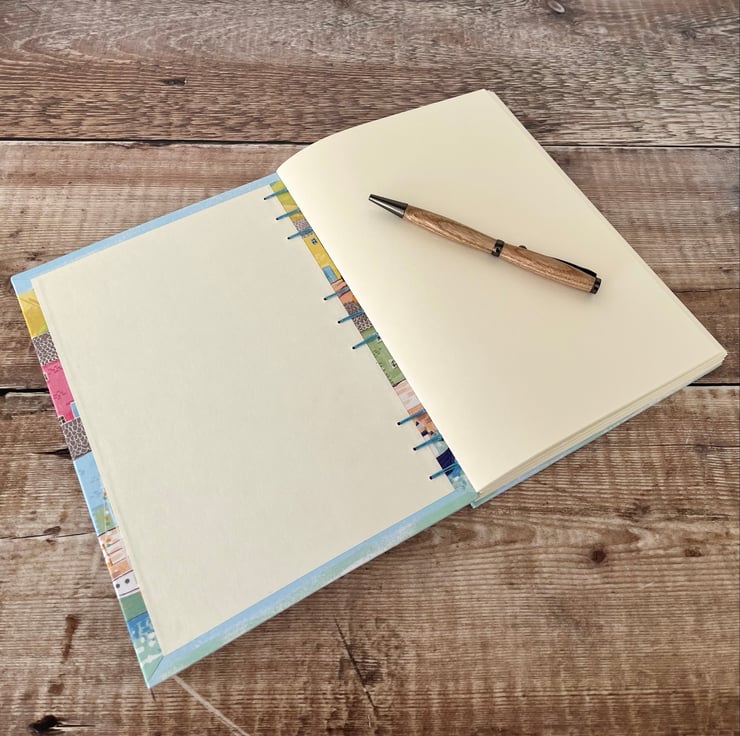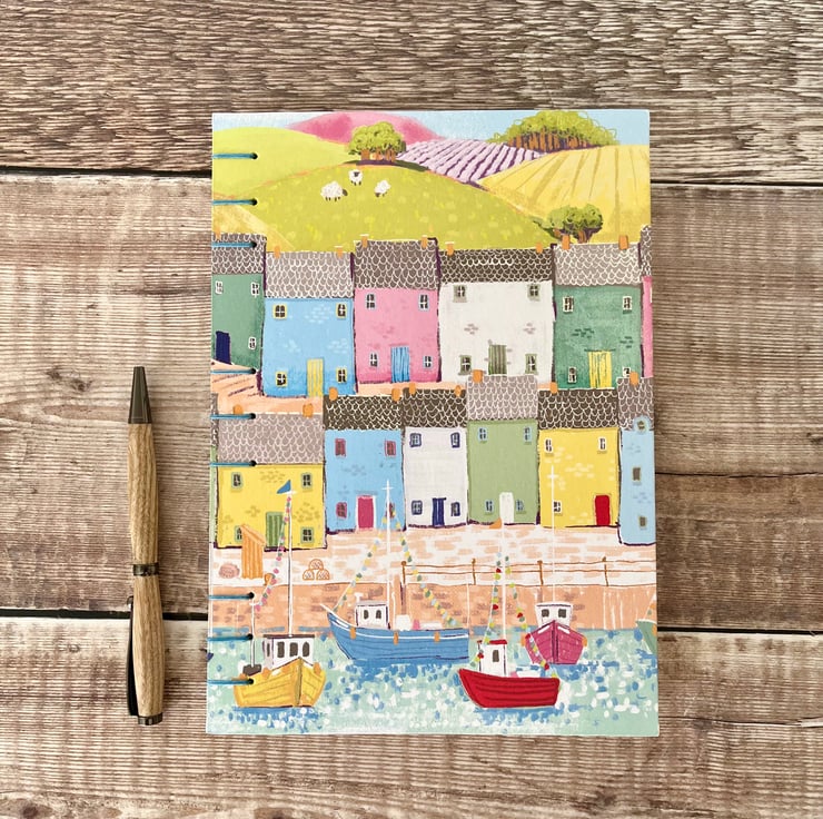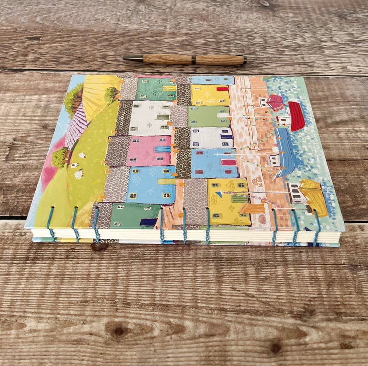 This A5 journal sketchbook is covered with a beautifully nostalgic coastal scene and bound using Coptic Stitch.