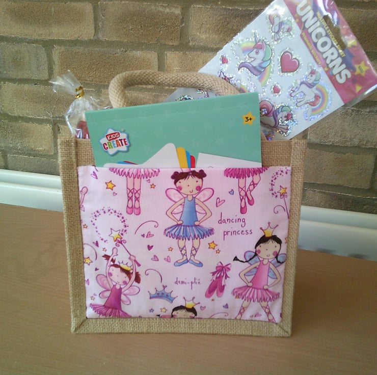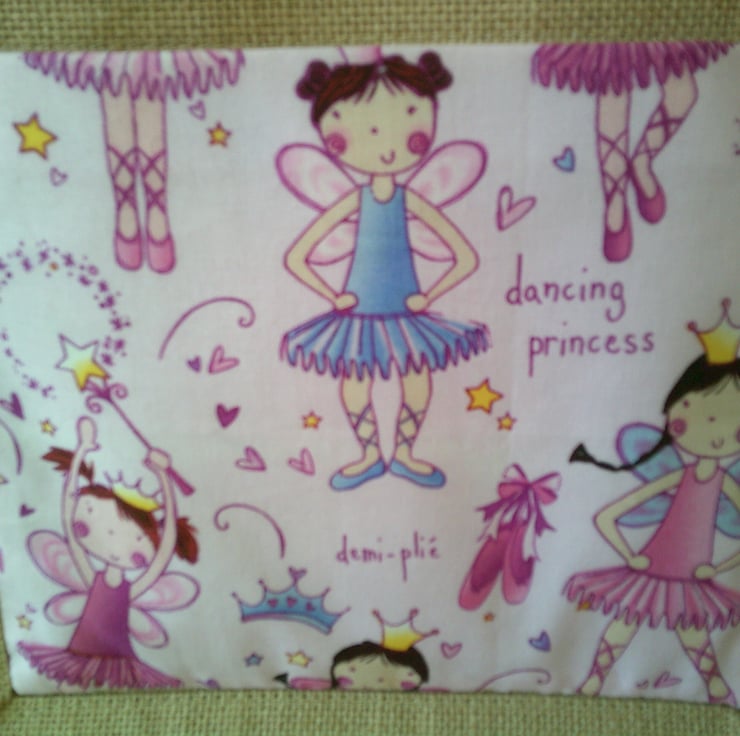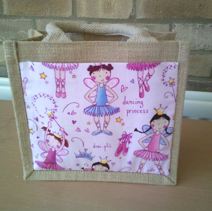 The bag itself measures approximately 22 x 20 x 13 cm (9 x 8 x 5 inches). The fabric pocket - which has been hand sewn onto the bag has a design of Ballerina fairies on a pink background.