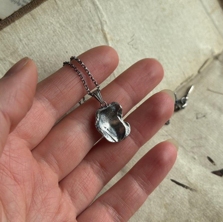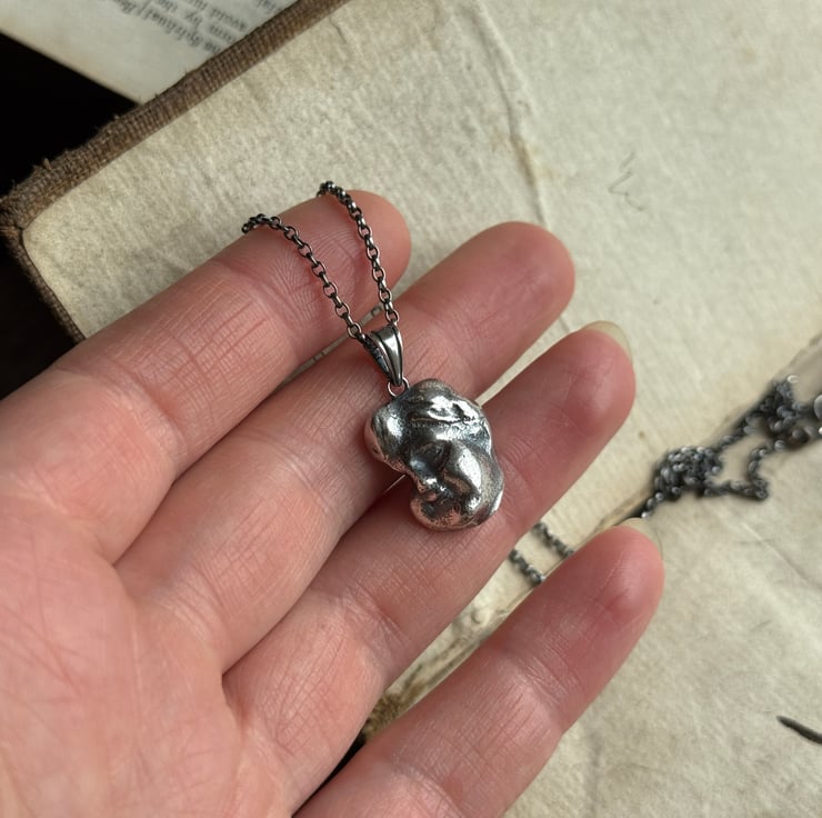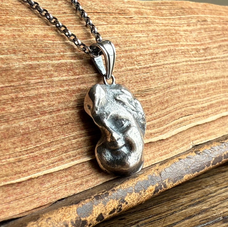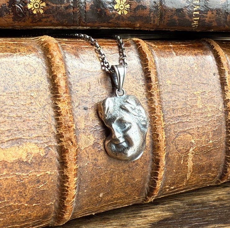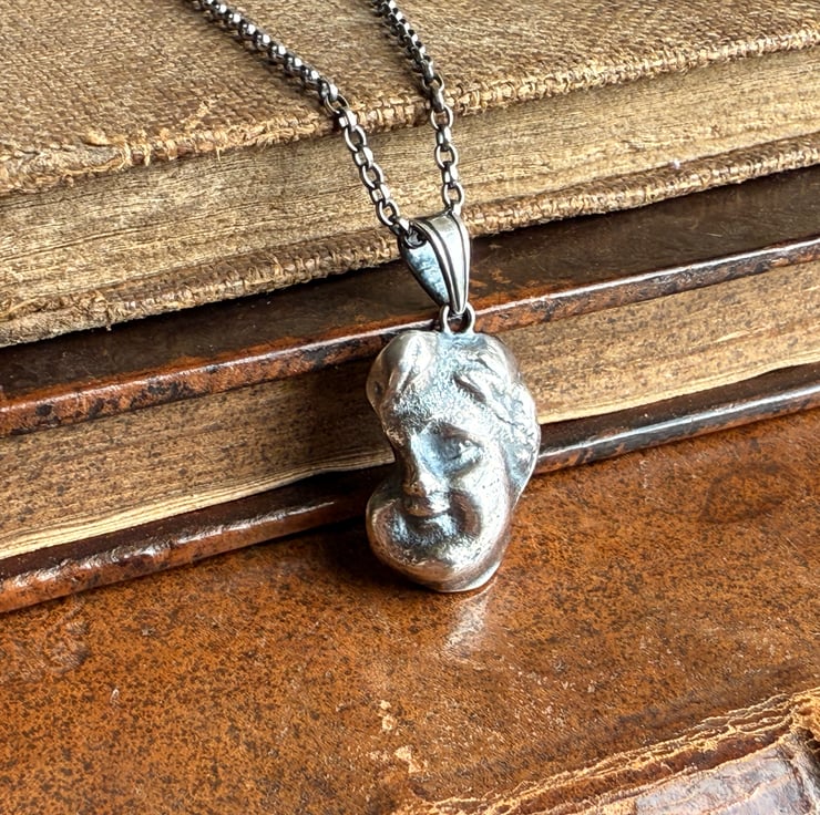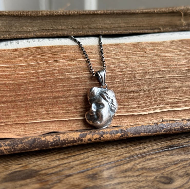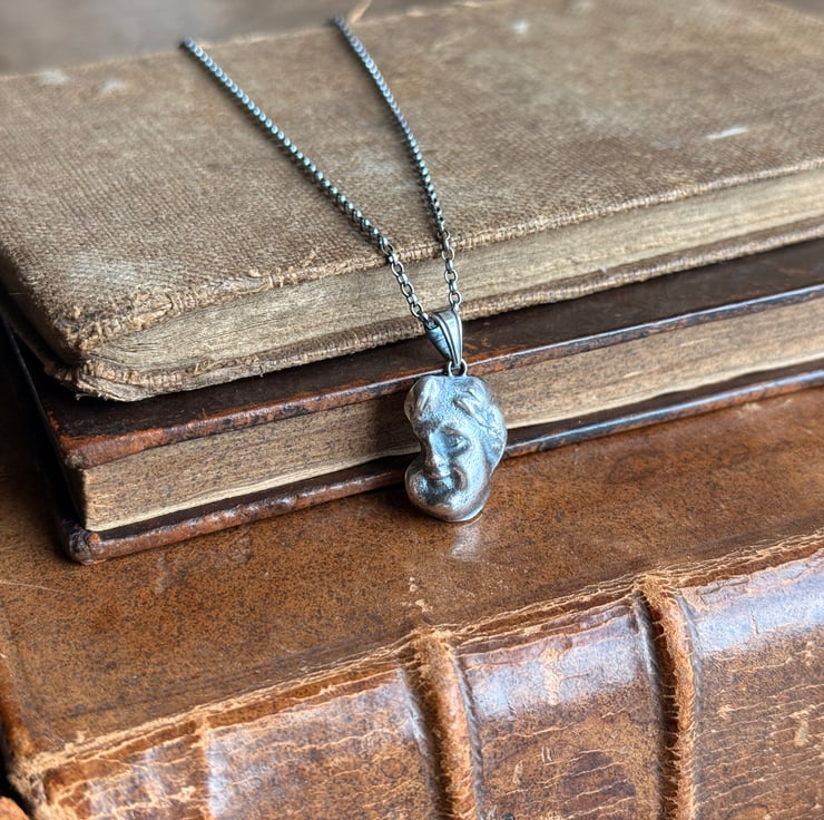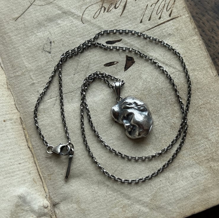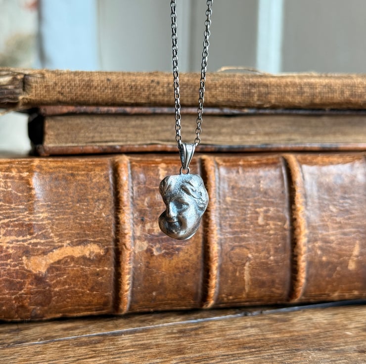 Sterling silver dolls face fragment pendant. Made from a recycled silver cast of a sherd of broken doll head, the original Victorian porcelain face fragment was found during one of our mudlarking adventures!