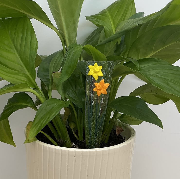 This pretty little fused glass plant pot stake would make a lovely keepsake gift. It features two daffodils in sunshine yellow and marigold on a clear glass base.