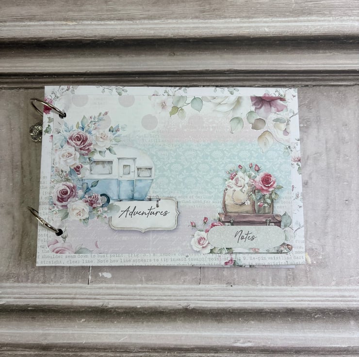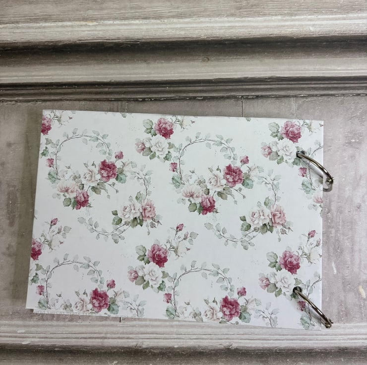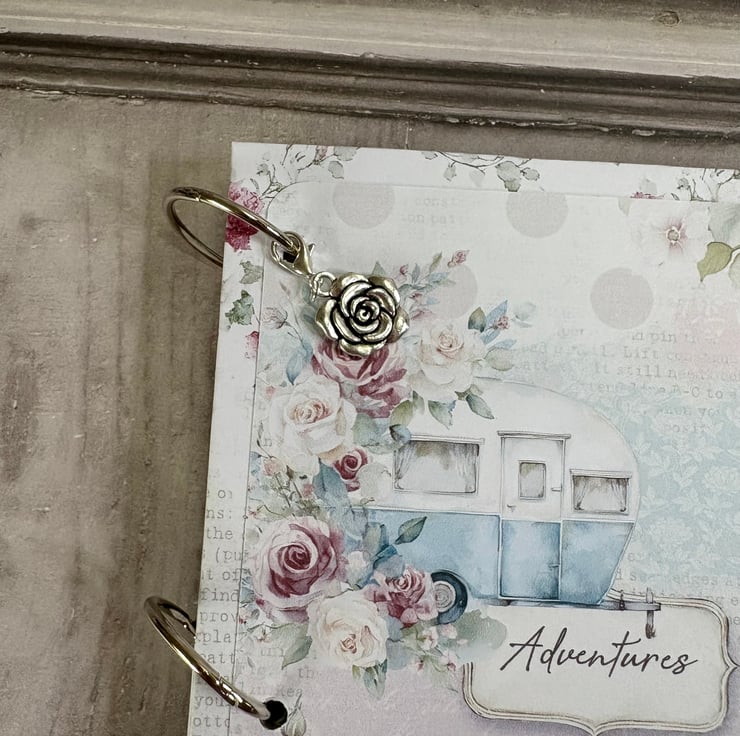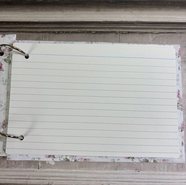 Hardback index card notebook. Covered in a pretty design paper, card topper with ‘Notes’ added to bottom right corner. Ring binder clips for easy refilling. Pretty rose charm on a lobster clasp on the top ring, Holds 50 4” x 6” index cards. Overall measurements: 4.5” x 6.6”