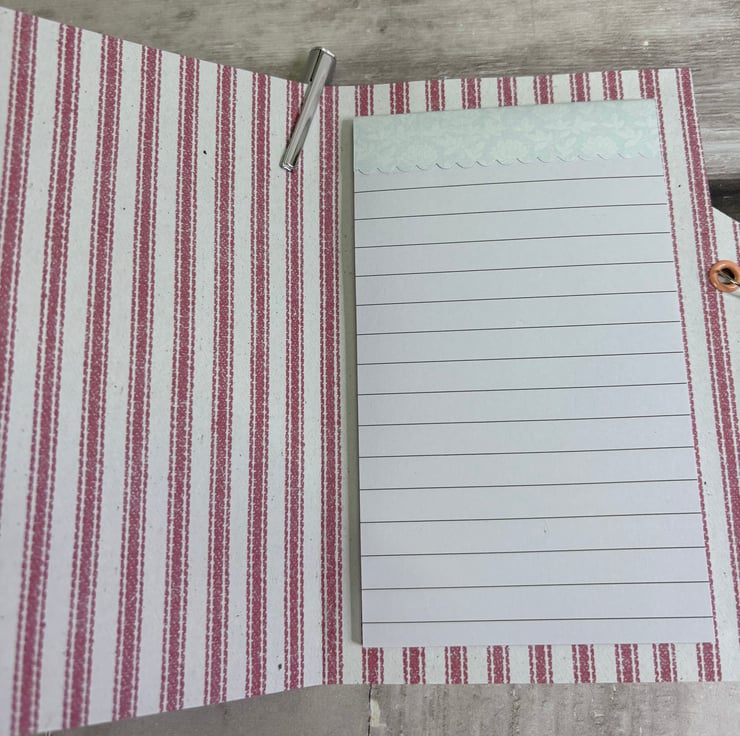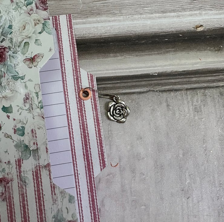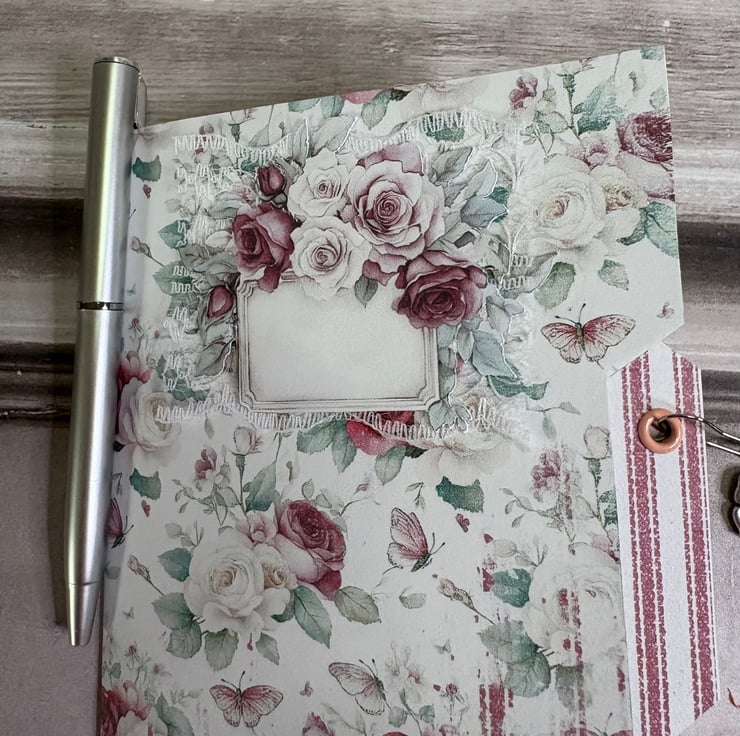 Mini file folder in a design print with a lace and name plaque on the front, including mini silver tone pen. Lined and plain paper notepad with 60 pages. Eyelet on tab with a rose charm on a lobster clasp. Measures 4 1/8 x 5.75”