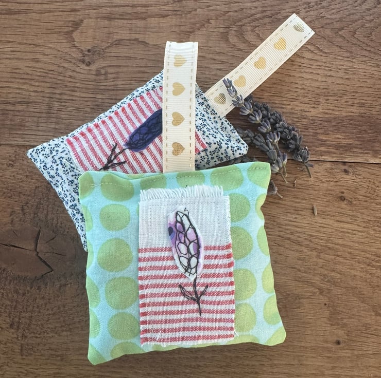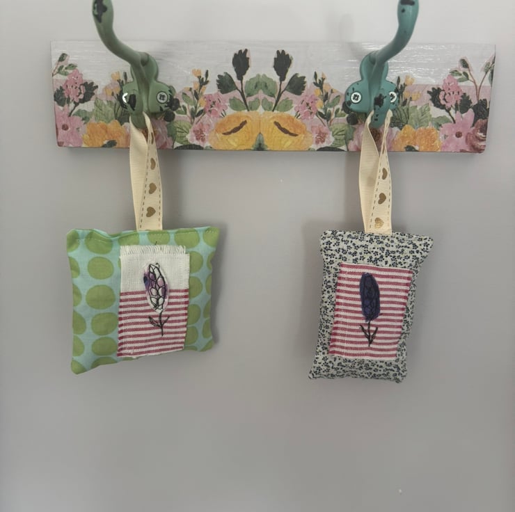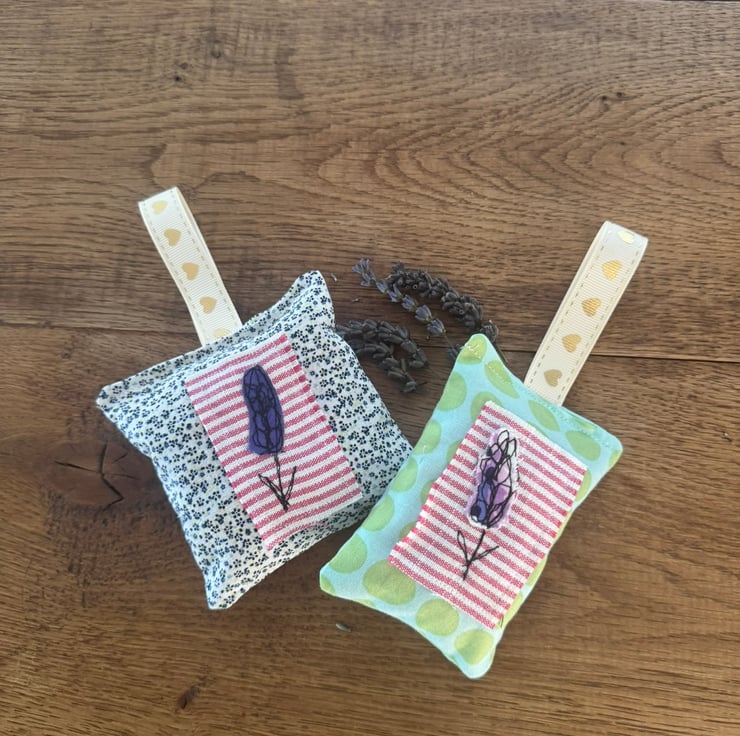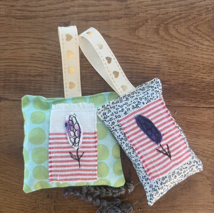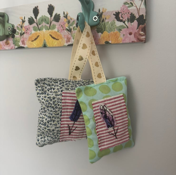Both bags are finished with a pretty cream ribbon loop adorned with golden hearts, allowing them to be hung easily from a hook or hanger. The natural, calming aroma of the lavender will gently infuse your space, helping to repel moths and provide a peaceful, fresh scent.