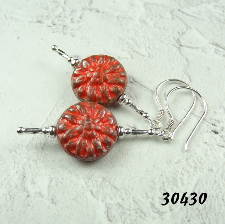 These sterling silver drop earrings have a Czech glass coin shaped bead, which has a pressed dahlia flower pattern on both sides. They come in a choice of 10 colours, see my other listings for these.