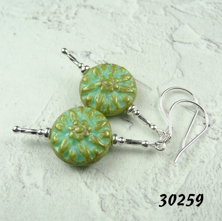 These sterling silver drop earrings have a Czech glass coin shaped bead, which has a pressed dahlia flower pattern on both sides. They come in a choice of 10 colours, see my other listings for these.