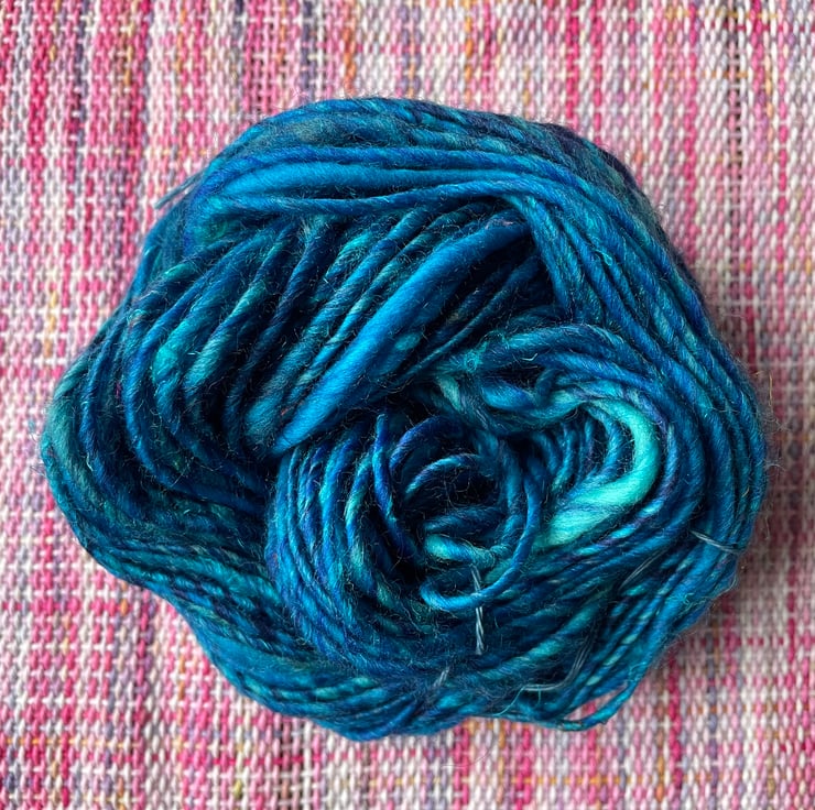 Colours are blended on a drum carder and then the yarn is spun on an Ashford traditional spinning wheel. All made by hand, this art yarn is perfect for your next project. That might be knitting, crochet, weaving, embroidery or felting! The only limit is your imagination!! If you're stuck for ideas, find me on Tiktok where I regularly post projects I have completed using my handspun yarn.