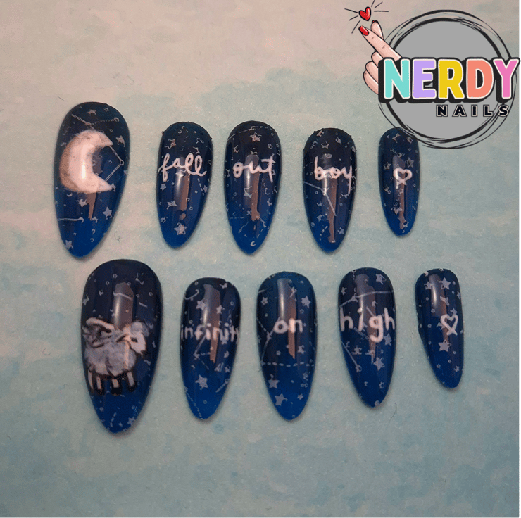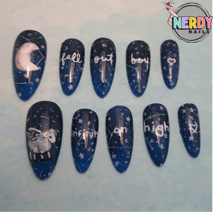 Set of ten hand crafted Press on Nails with Infinity on High inspired artwork. Available in almond, square, stiletto, coffin, and oval.